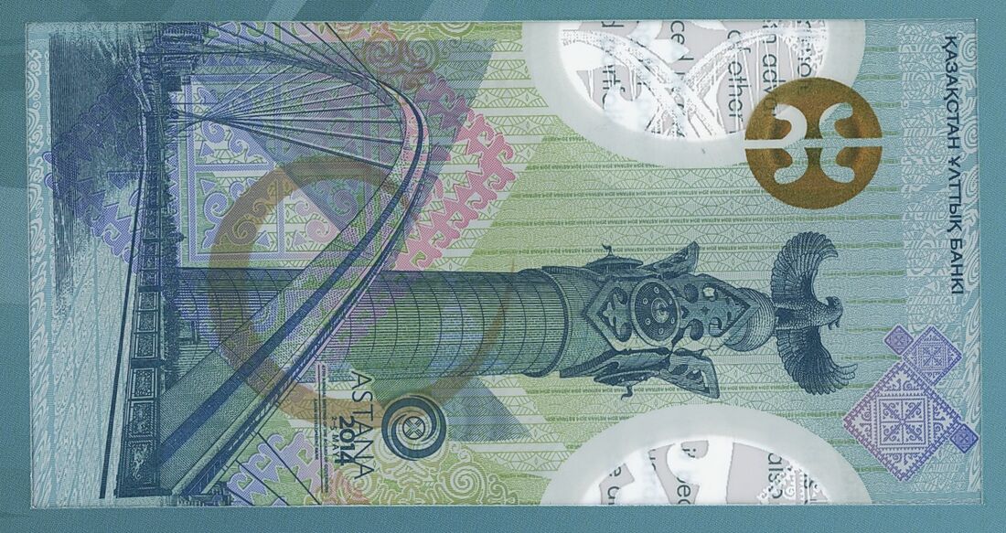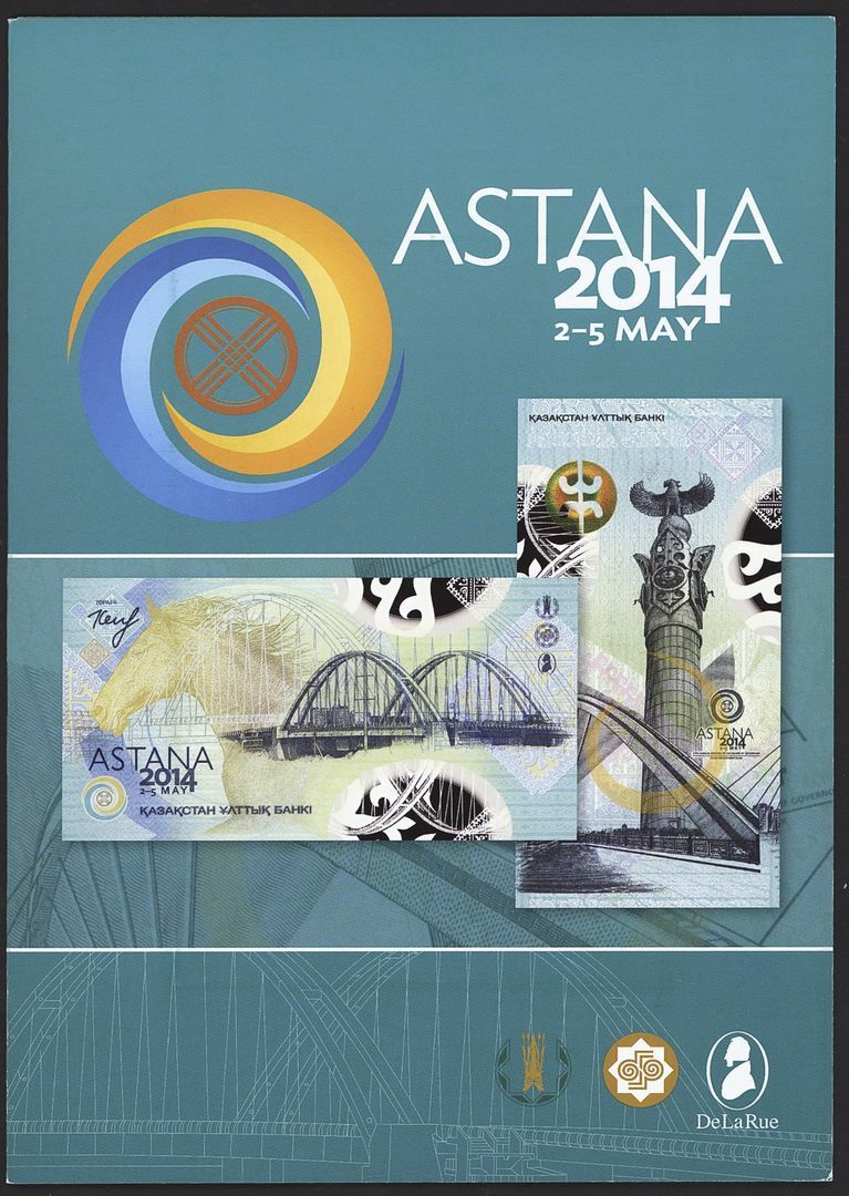 Commemorative De La Rue polymer house note in folder celebrating the Asian Development Bank's conference in Astana, Kazakhstan in 2014;