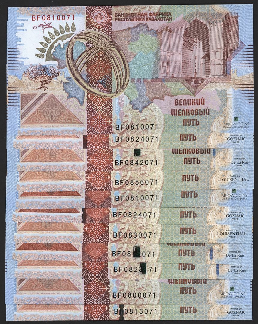 The Great Silk Way 2008 brochure by the Banknote Factory of the Republic of Kazakhstan, contains 18 house notes demonstrating substrates and features from different currency component suppliers;