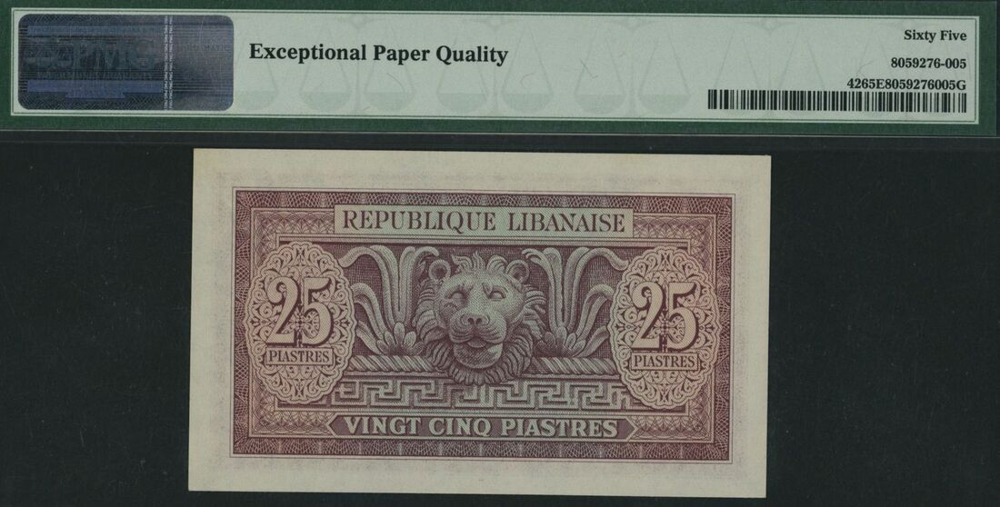 (x) République Libanaise, Lebanon, 25 Piastres, 1948-50, serial number D475238, (Pick 42, PCLB 80/84a), in PMG holder 65 EPQ Gem Uncirculated