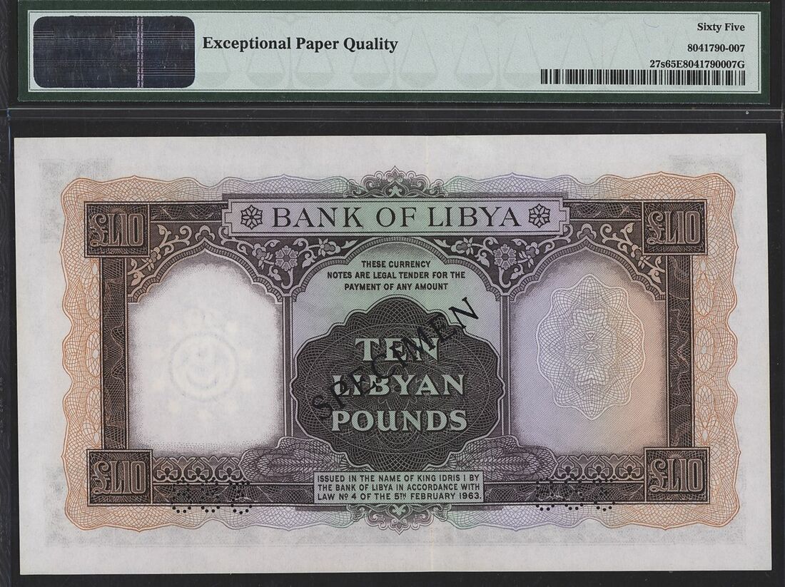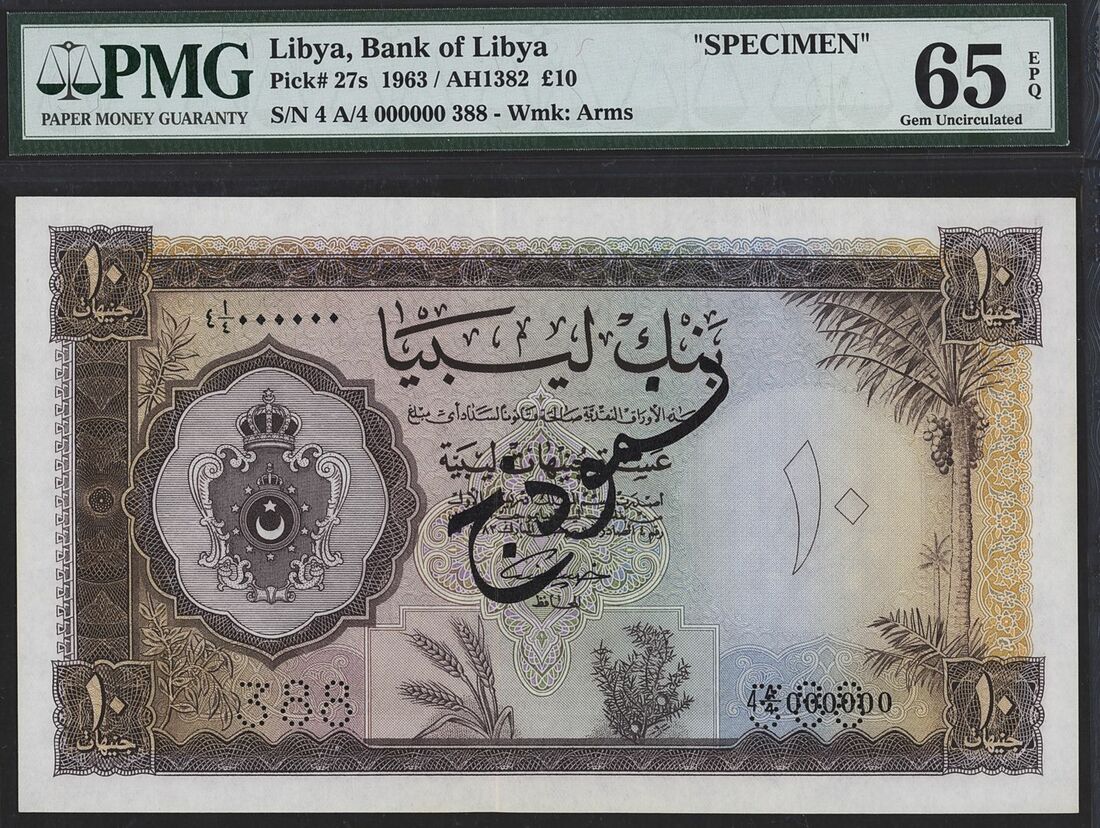 (x) Bank of Libya, specimen £10, 1963 / AH1382, serial number 4 A/4 000000 388, (Pick 27s), in PMG holder 65 EPQ Gem Uncirculated