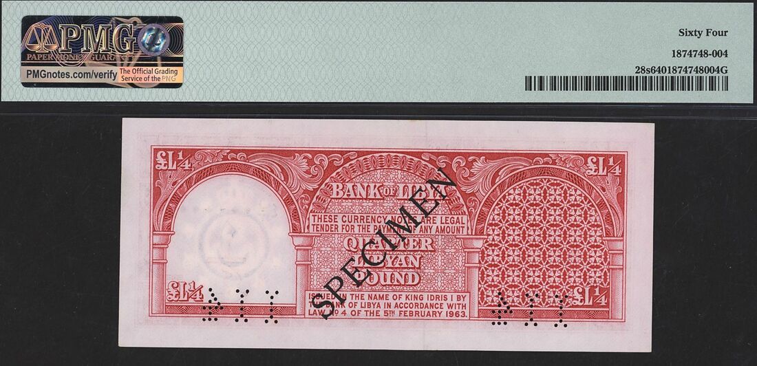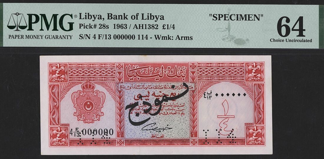 (x) Bank of Libya, specimen £1/4, 1963 / AH1382, serial number 4 F/13 000000 114, (Pick 28s), in PMG holder 64 Choice Uncirculated