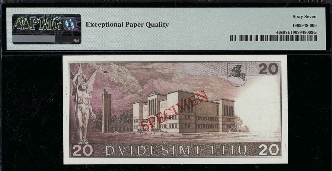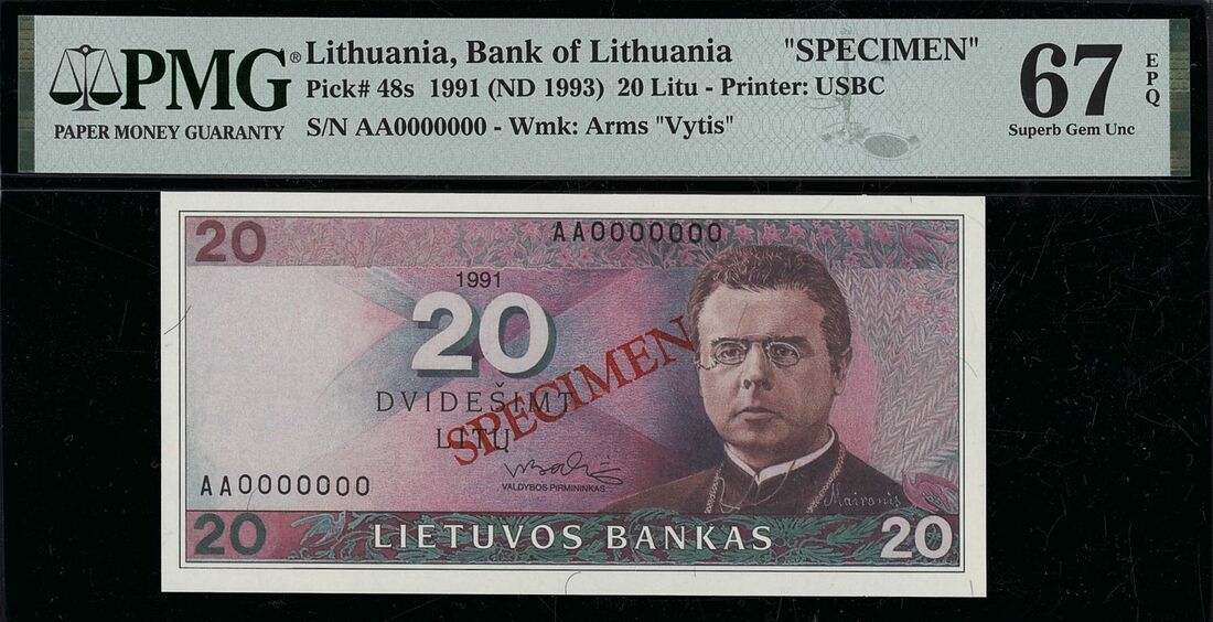 (x) Lietuvos Bankas, specimen 20 Litu, 1991 (ND 1993), serial number AA0000000,