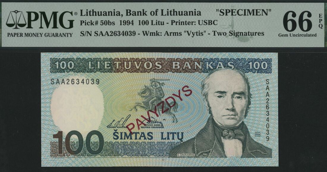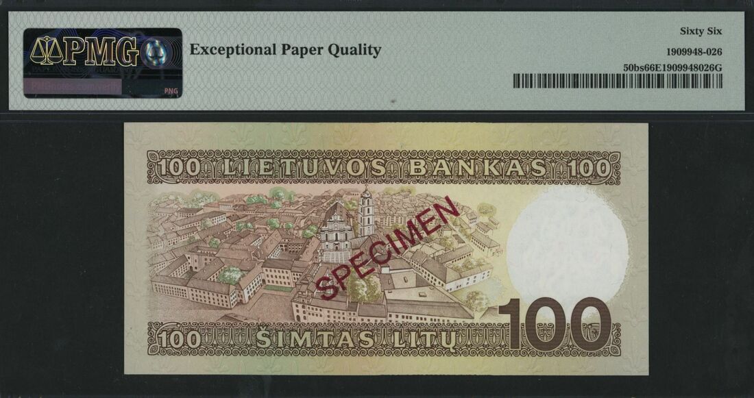 (x) Lietuvos Bankas, [Top Pop] specimen 100 Litu, 1994, serial number SAA2634039, two signatures,