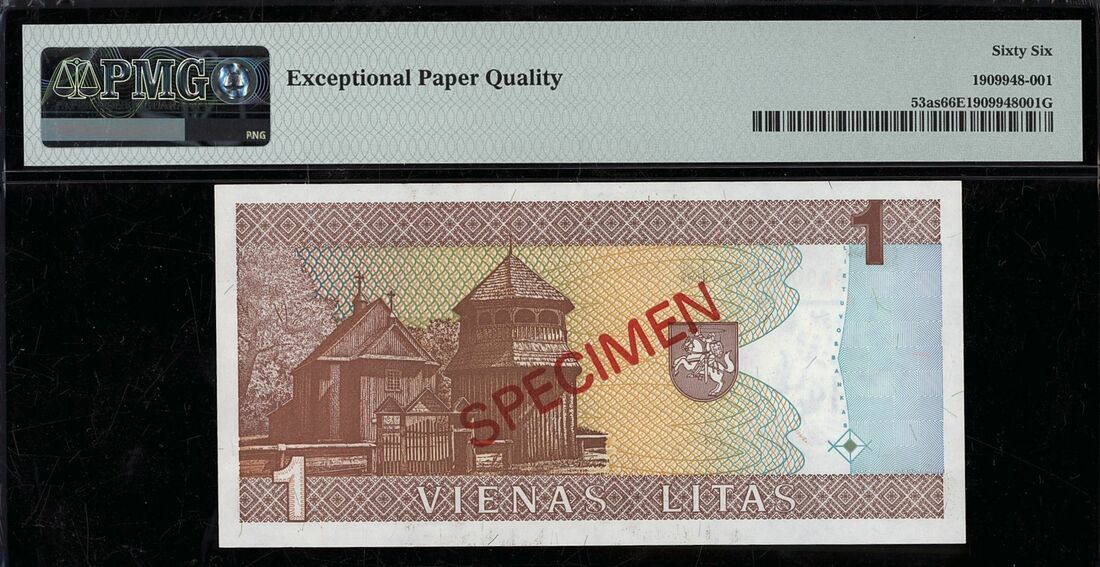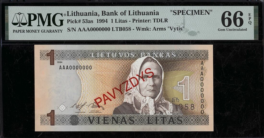 (x) Lietuvos Bankas, specimen 1 Litas, 1994, serial number AAA0000000 LTB 058,