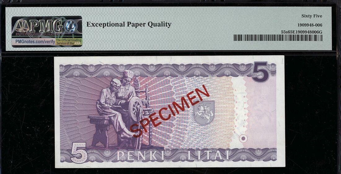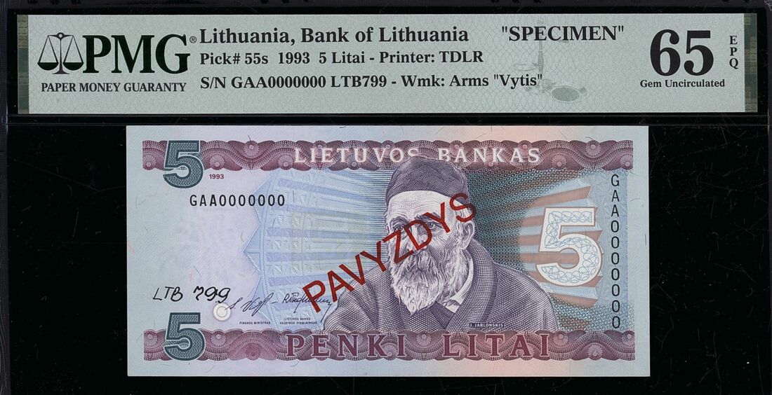 (x) Lietuvos Bankas, specimen 5 Litai, 1993, serial number GAA0000000 LTB 799,