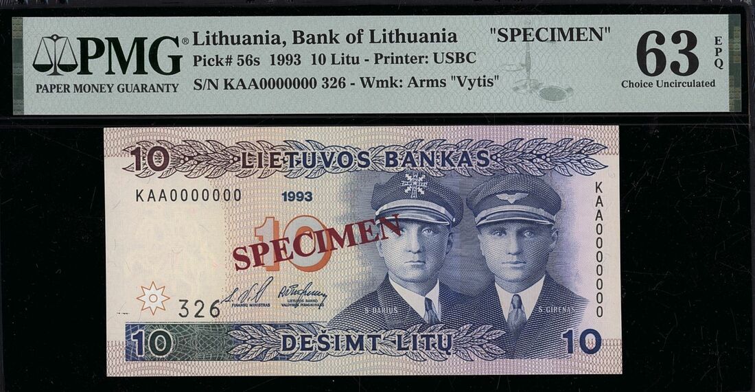 (x) Lietuvos Bankas, 10 Litu, 1993, serial number KAA0000000326,