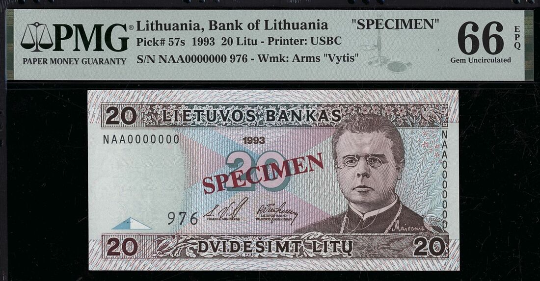 (x) Lietuvos Bankas, specimen 20 Litu, 1993, serial number NAA0000000 976,