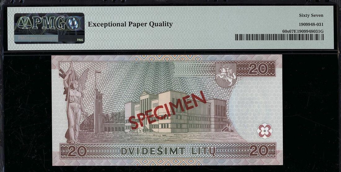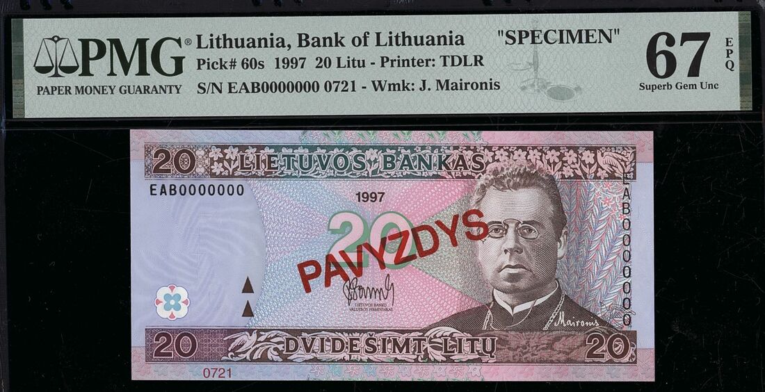 (x) Lietuvos Bankas, [Top Pop] specimen 20 Litu, 1997, serial number EAB0000000 0721,