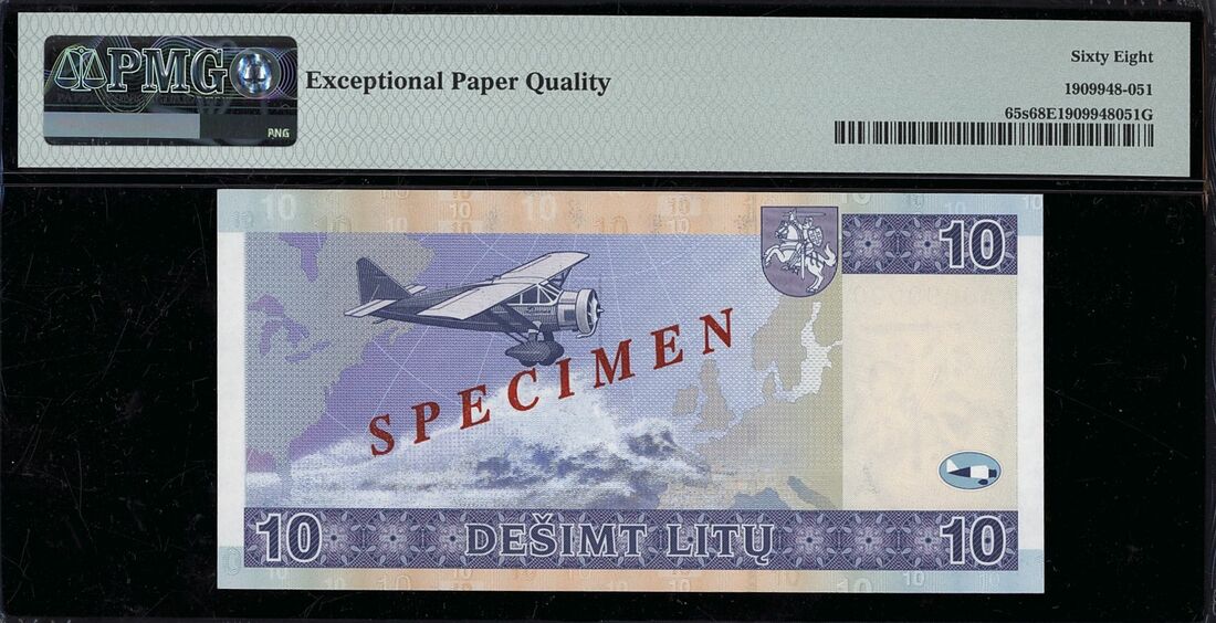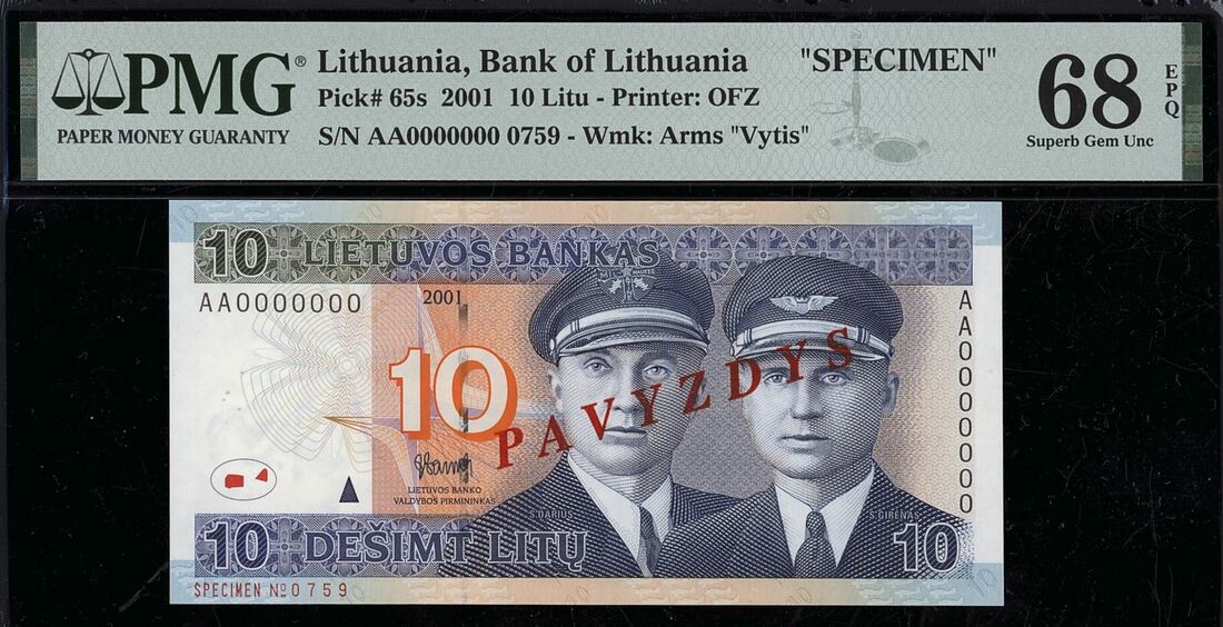 (x) Lietuvos Bankas, [Top Pop] specimen 10 Litu, 2001, serial number AA0000000 0759,