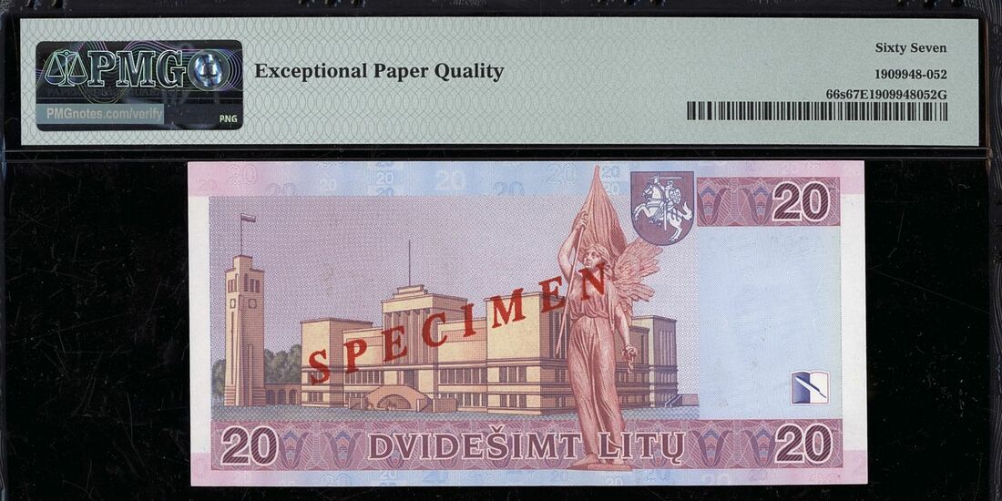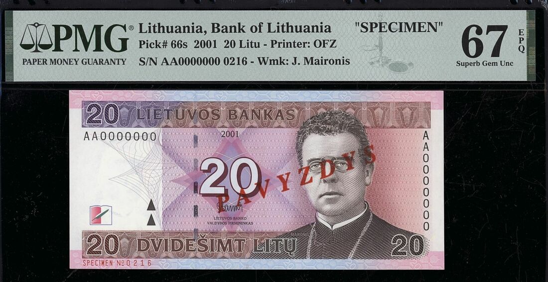 (x) Lietuvos Bankas, [Top Pop] specimen 20 Litu, 2001, serial number AA0000000 0216,