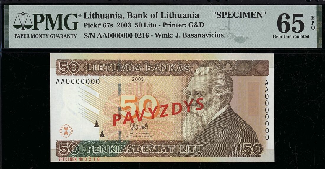 (x) Lietuvos Bankas, specimen 50 Litu, 2003, serial number AA0000000 0216,