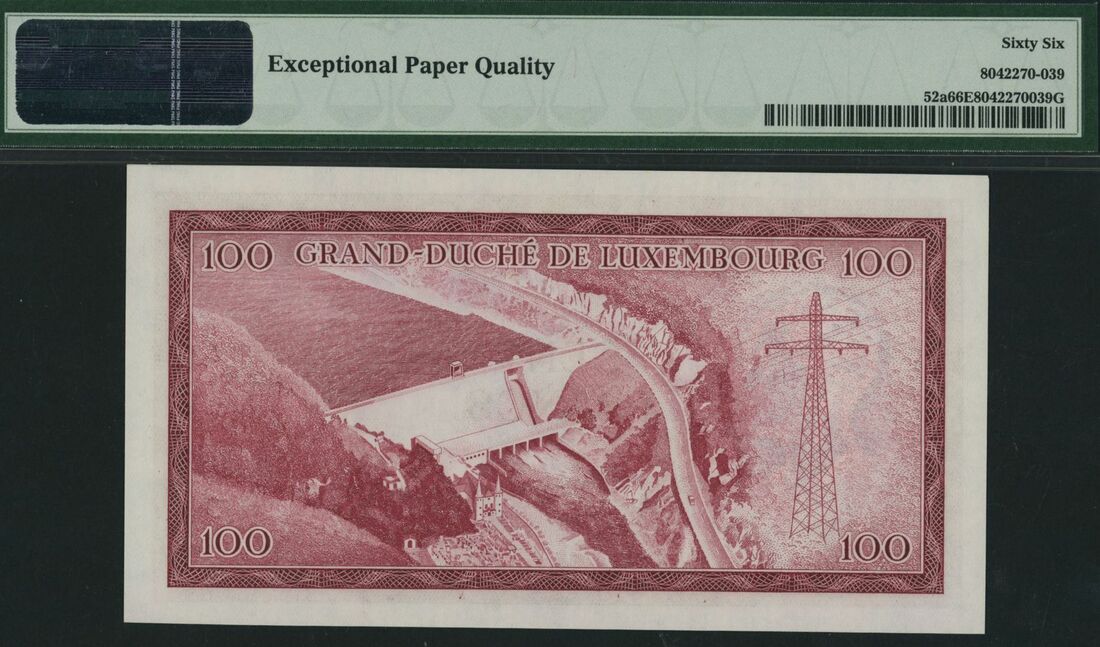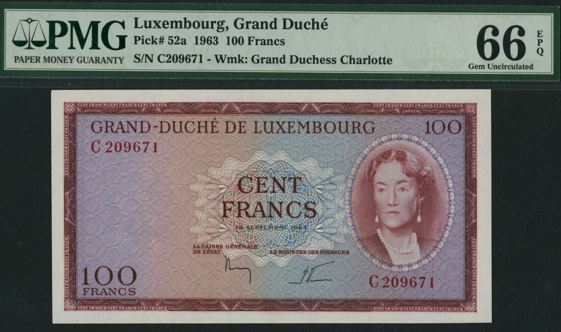 (x) Grand Duché, Luxembourg, 100 Francs, 18th September 1963, serial number C209671, (Pick 52a, BNB 335), in PMG holder 66 EPQ Gem Uncirculated