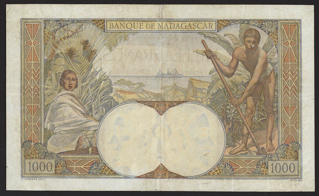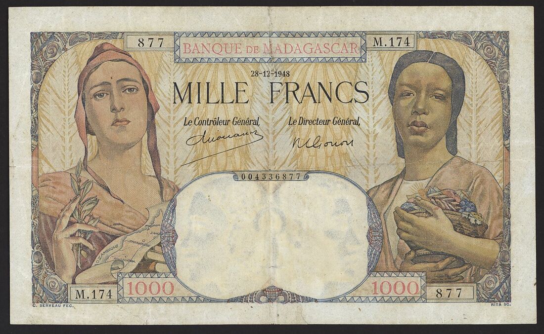 (x) Banque de Madagascar, 1000 Francs, 28th December 1948, serial number M.174 877, (Pick 41, BNB 208f), fine