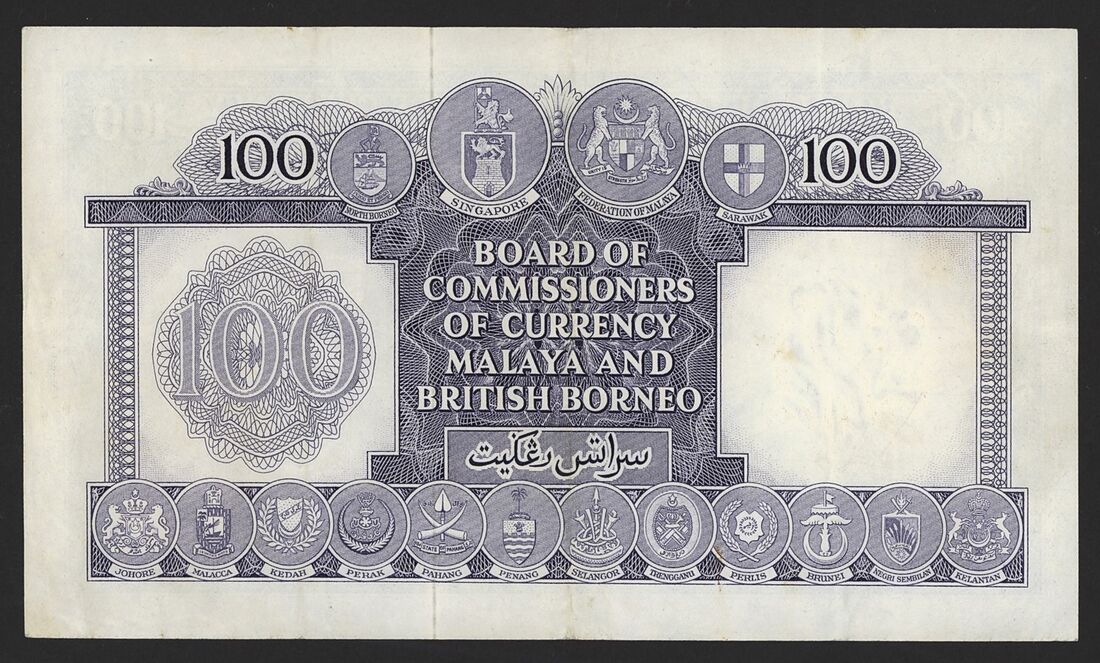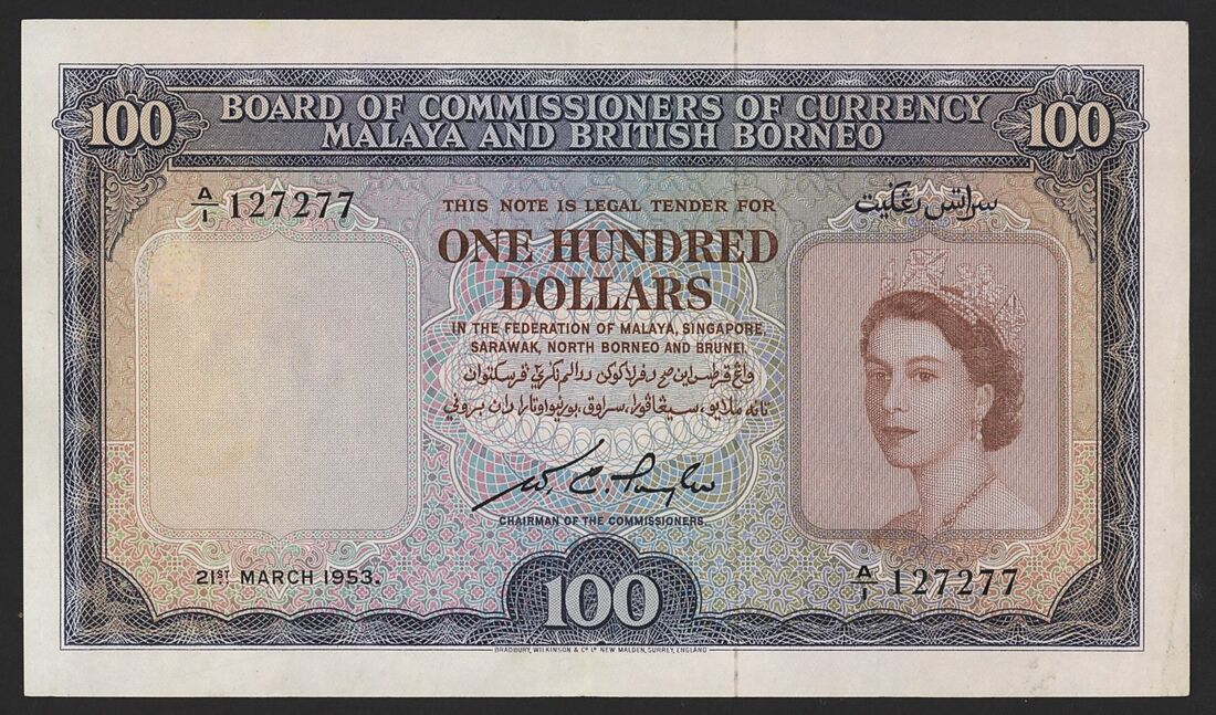(x) Malaya and British Borneo, 100 Dollars, 21st March 1953, serial number A/1 127277, (Pick 5, BNB 105a), extremely fine