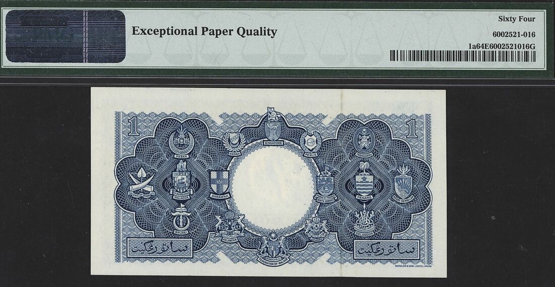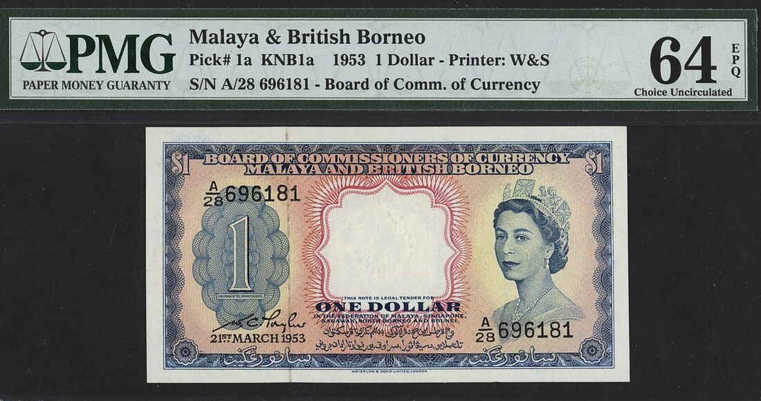 (x) Board of Commissioners of Currency, Malaya & British Borneo, 1 Dollar, 21st March 1953, serial number A/28 696181, (Pick 1a), in PMG holder 64 EPQ Choice Uncirculated
