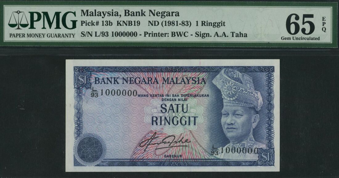 (x) Bank Negara, Malaysia, 1 Ringgit, ND (1981-83), serial number L/93 1000000, (Pick 13b, KNB19a-c), in PMG holder 65 EPQ Gem Uncirculated, 1 Million serial number