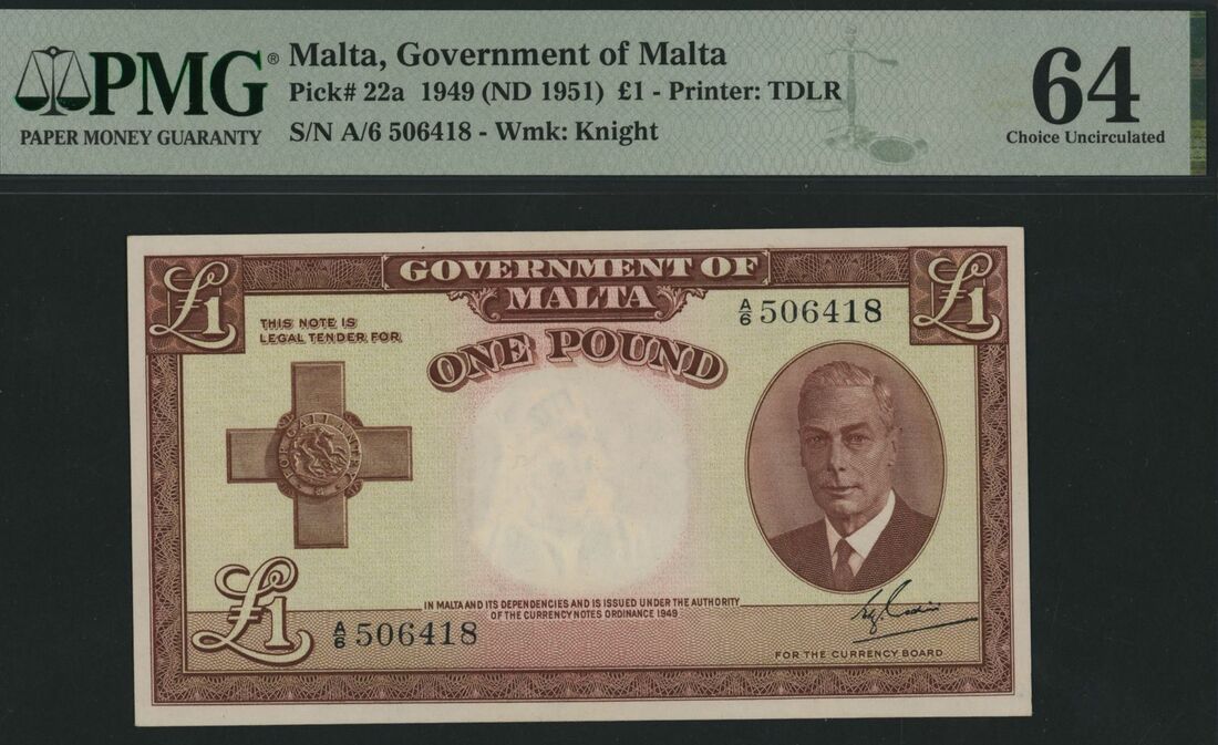 Government of Malta, £1, 1949 (ND 1951), serial number A/6 506418, (Pick 22a), in PMG holder 64 Choice Uncirculated
