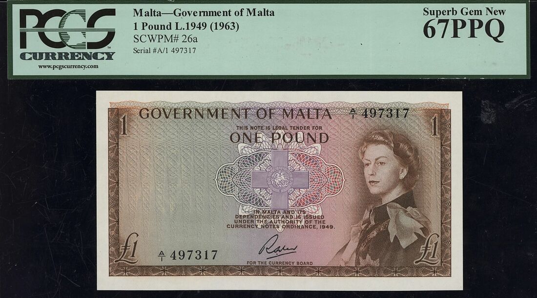 (x) Government of Malta, £1, L-1949 (1963), serial number A/1 497317, (Pick 26a), in PCGS holder 67 PPQ Superb Gem New
