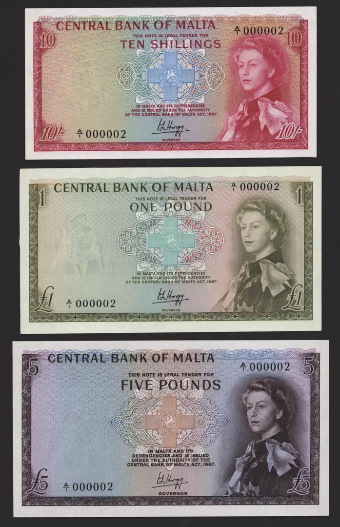 Central Bank of Malta, [3 notes] 10 Shillings, £1, £5, 1967, serial number A/1 000002,
