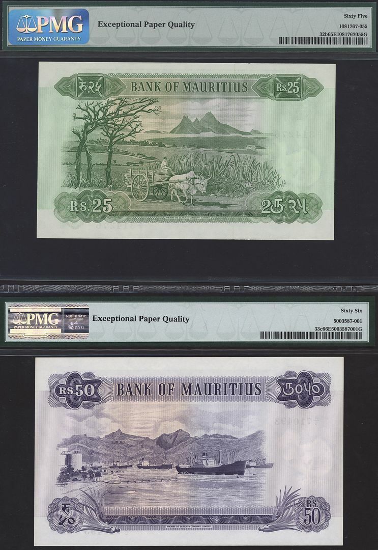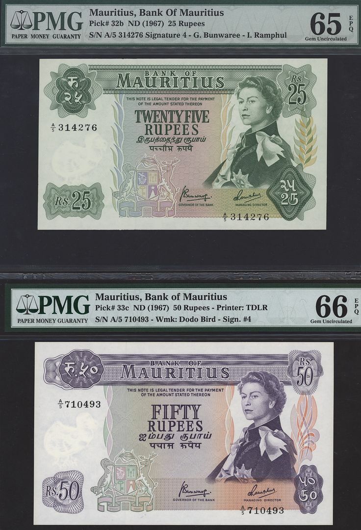 (x) Bank of Mauritius, [2 notes] 25, 50 Rupees, ND (1967), serial numbers A/5 314276 and A/5 710493, (Pick 32b, 33c), in PMG holders 65 EPQ Gem Uncirculated and 66 EPQ Gem Uncirculated (2 notes)