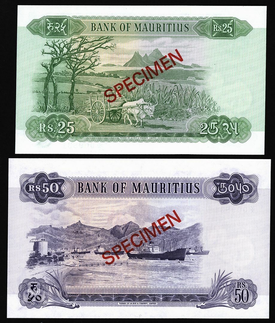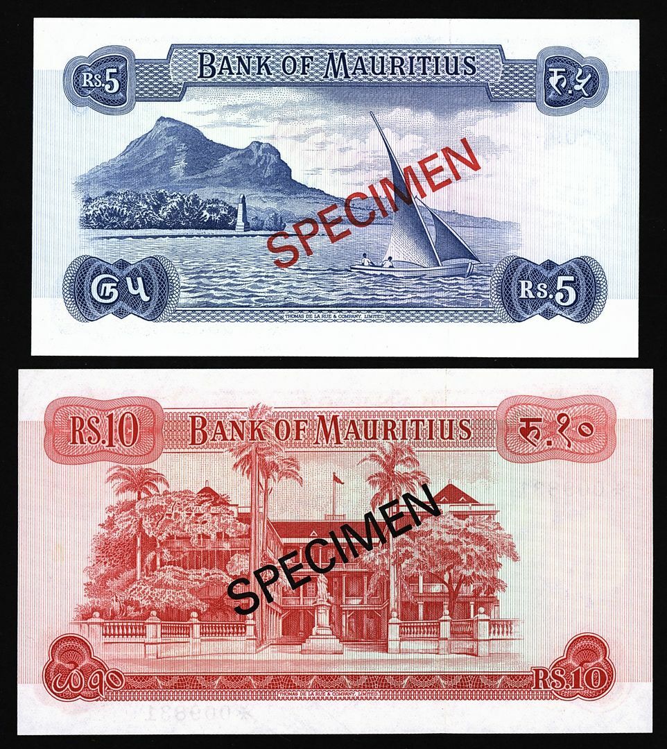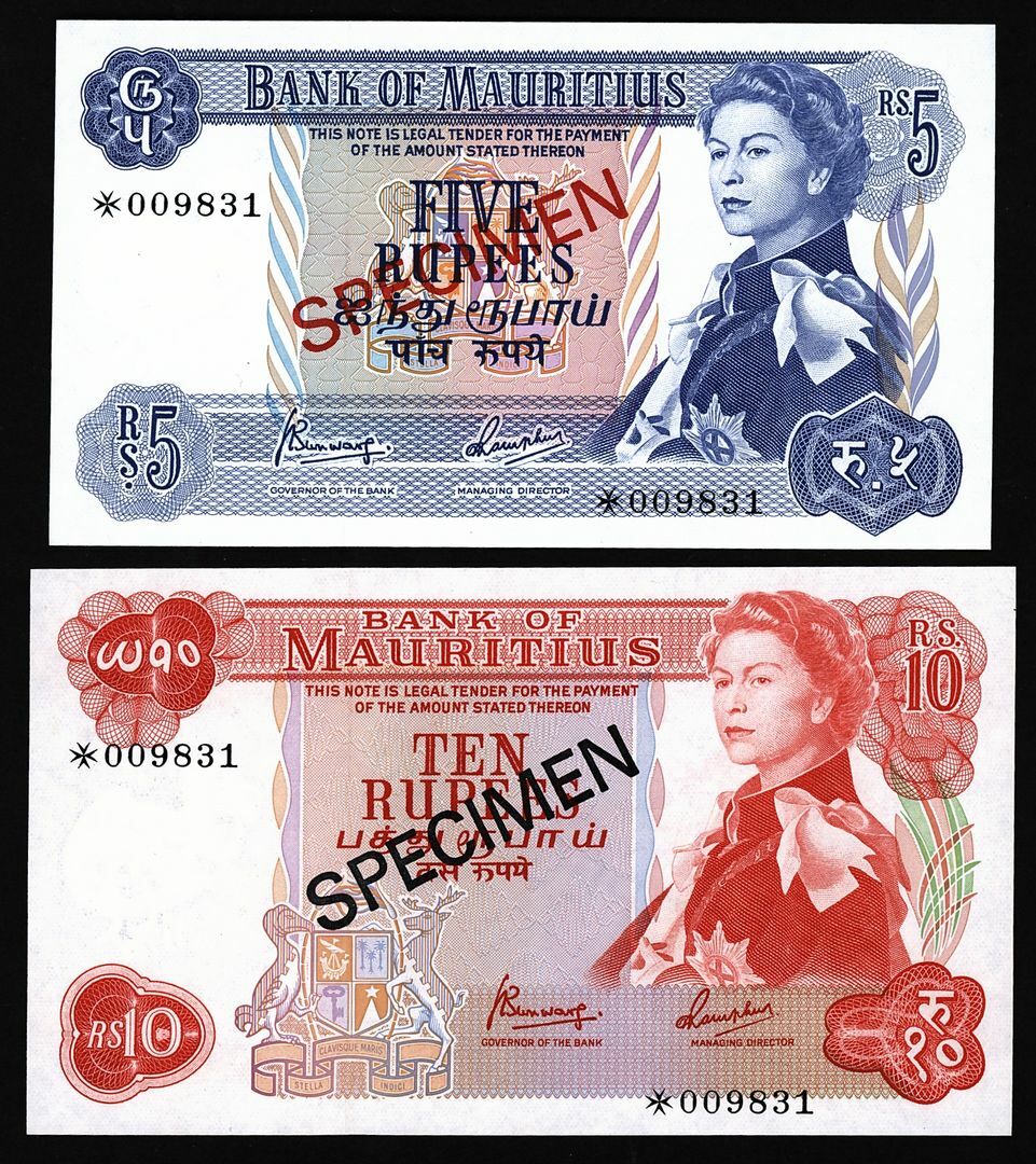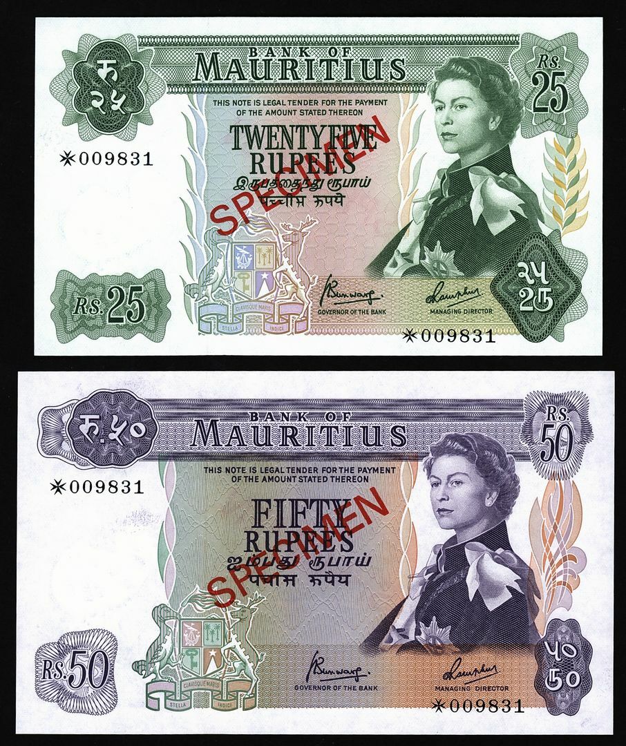 (x) Bank of Mauritius, Collector Series, [4 notes] specimen overprint £5, £10, £20, £50, ND (1978), with Maltese cross prefix, (Pick CS1, BNB 401), uncirculated, slight crease on two notes (4 notes)