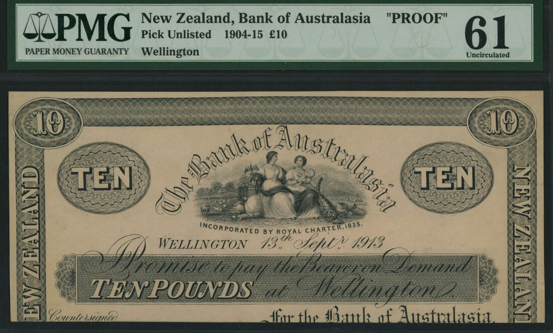 (x) Bank of Australasia, New Zealand, proof £10, Wellington, 13th September 1913, 8055297-071, (Pick unlisted), in PMG holder 61 Uncirculated, previously mounted