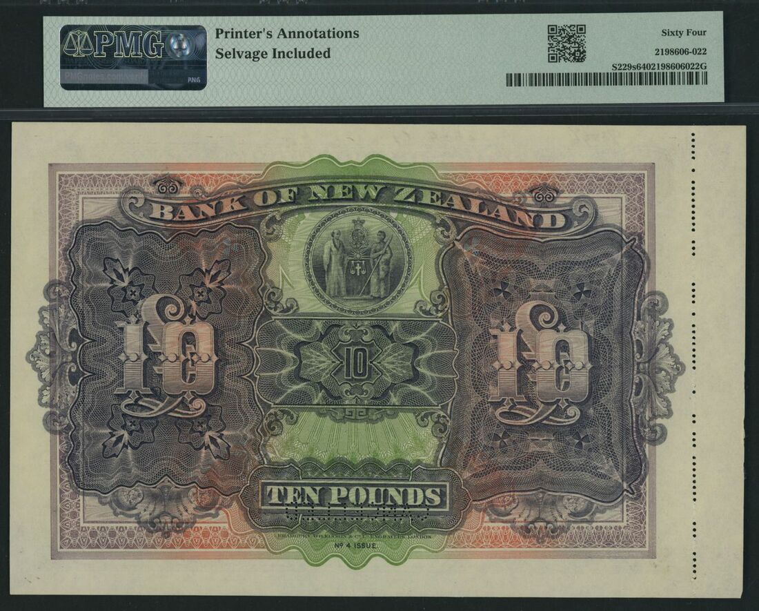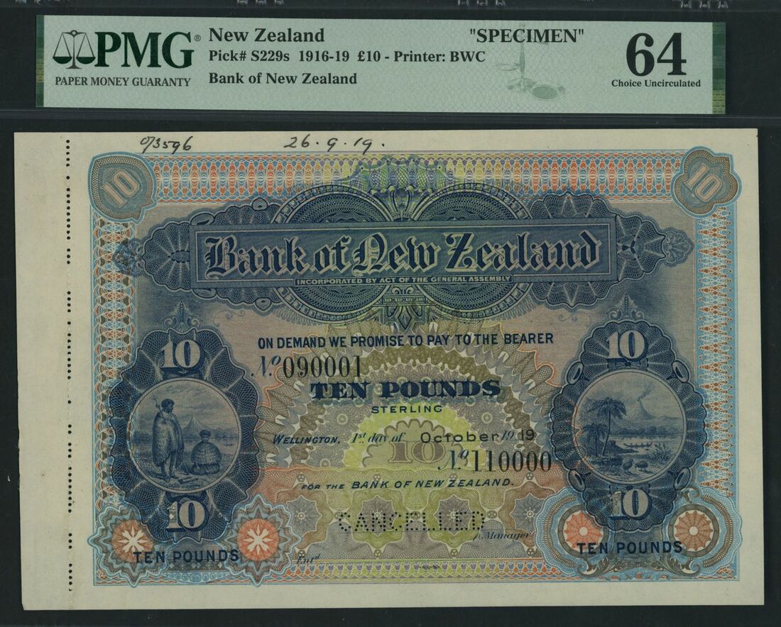 (x) Bank of New Zealand, specimen £10, Wellington, 1st October 1919, serial number range 090001-110000, (Pick S229s), in PMG holder 64 Choice Uncirculated, printer's annotations, selvage included, rare, only three graded by PMG