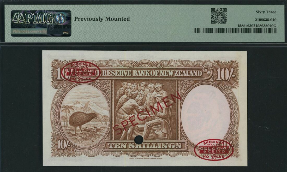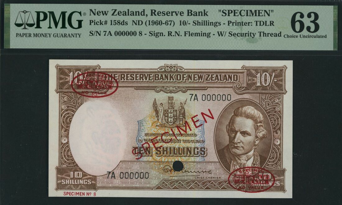 (x) Reserve Bank of New Zealand, specimen 10 Shillings, Wellington, ND (1960-67), serial number 7A 000000 8, (Pick 158ds), in PMG holder 63 Choice Uncirculated, previously mounted