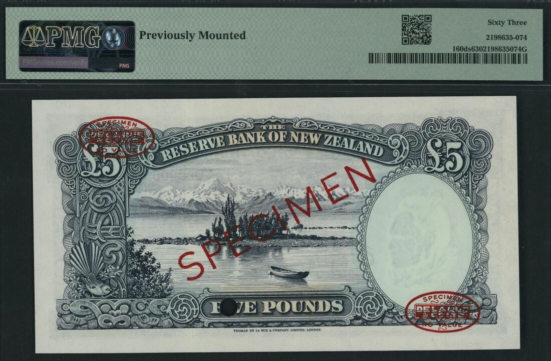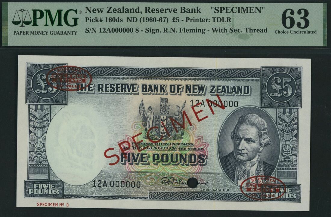 (x) Reserve Bank of New Zealand, specimen £5, Wellington, ND (1960-67), serial number 12A 000000 8, (Pick 160ds), in PMG holder 63 Choice Uncirculated, previously mounted