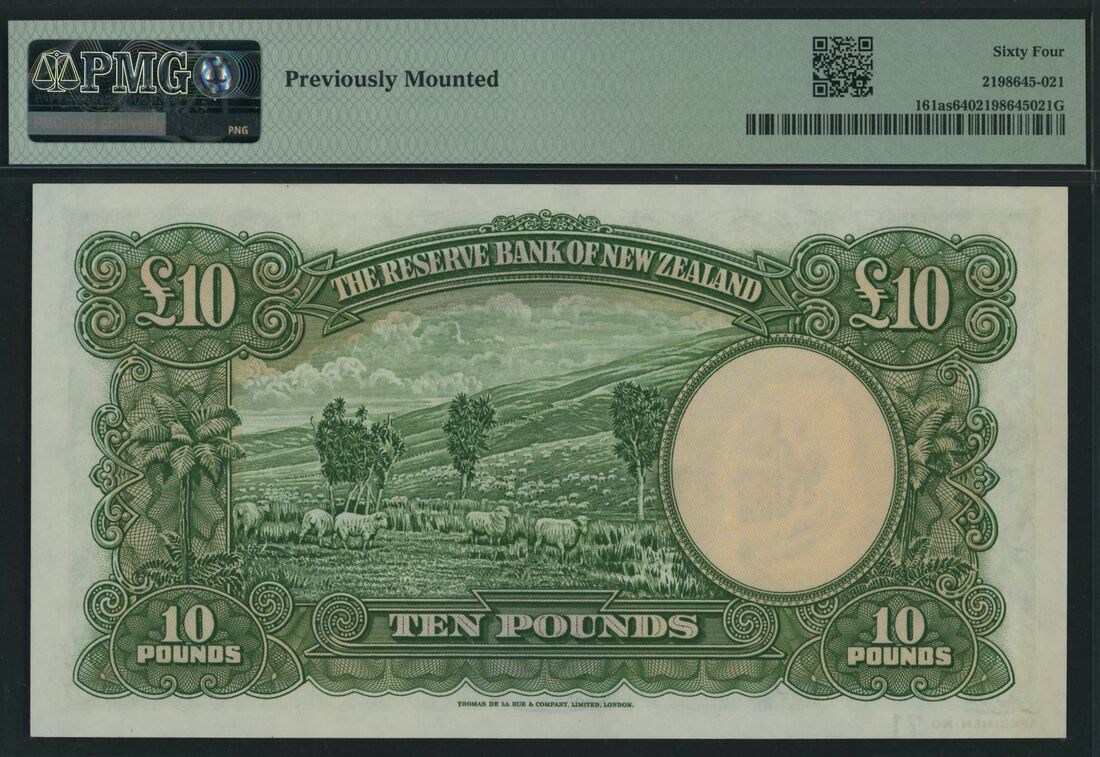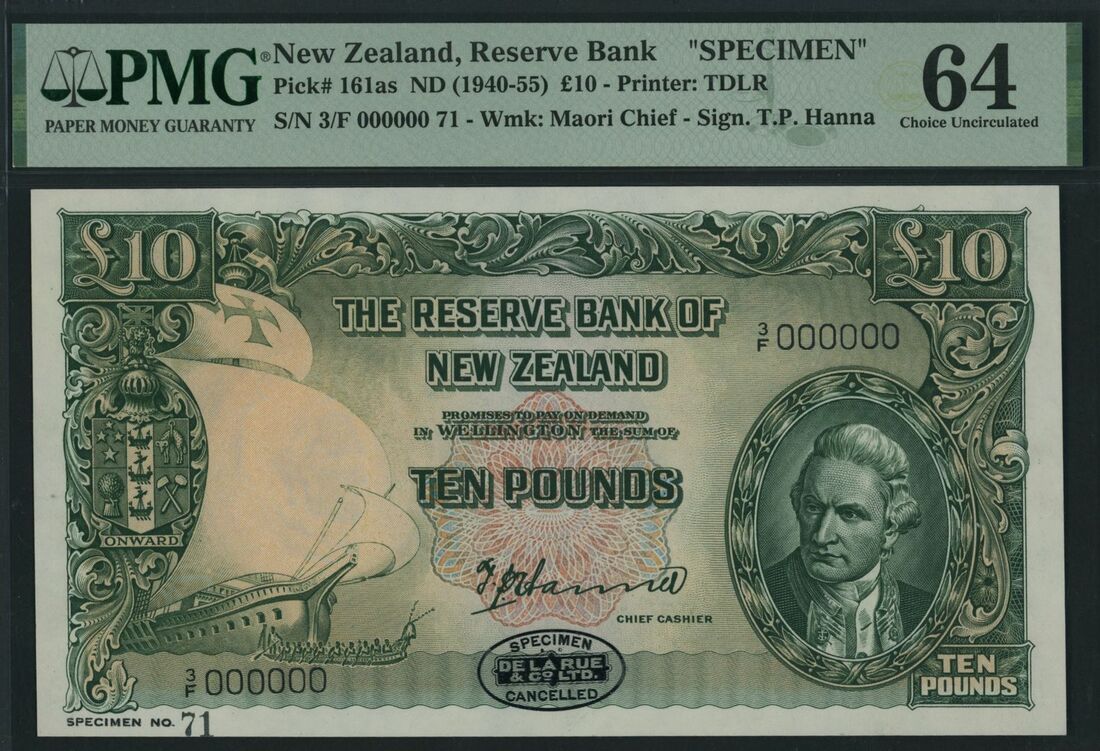 (x) Reserve Bank of New Zealand, specimen £10, Wellington, ND (1940-55), serial number 3/F 000000 71, (Pick 161as), in PMG holder 64 Choice Uncirculated, previously mounted