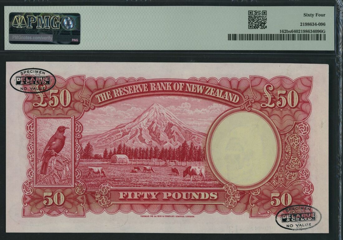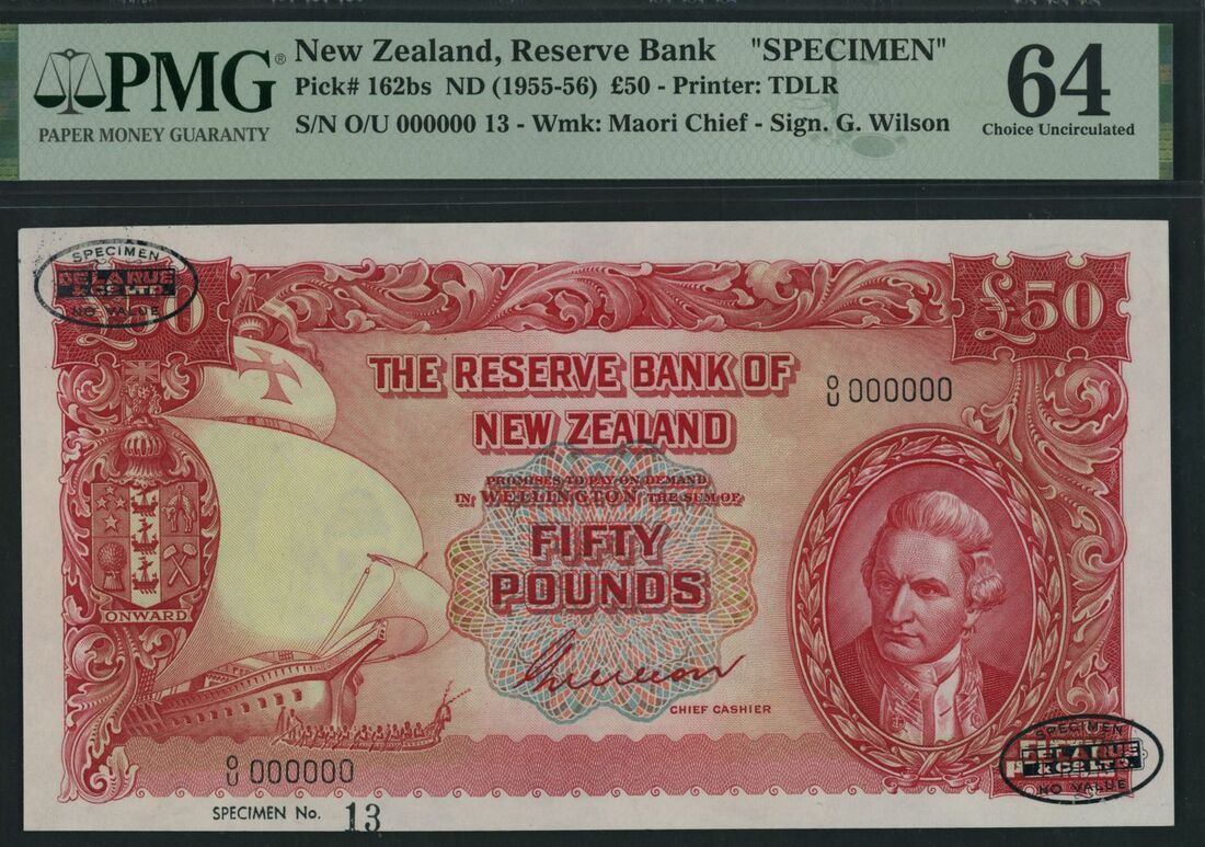 (x) Reserve Bank of New Zealand, [Top Pop] specimen £50, Wellington, ND (1955-56), serial number 0/U 000000 13, (Pick 162bs), in PMG holder 64 Choice Uncirculated, rare, only four notes graded by PMG and this note is in highest grade