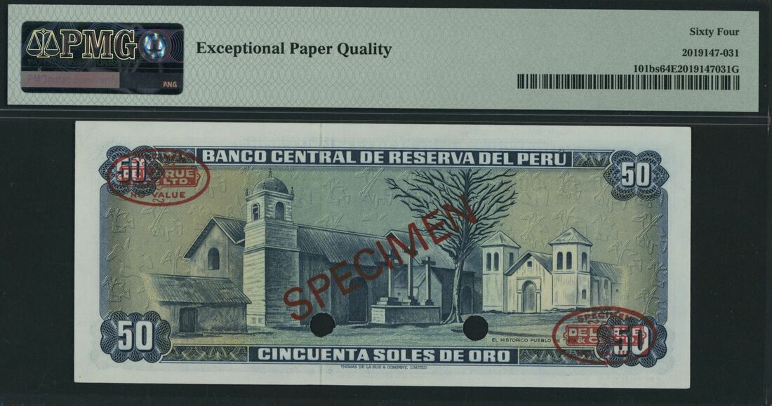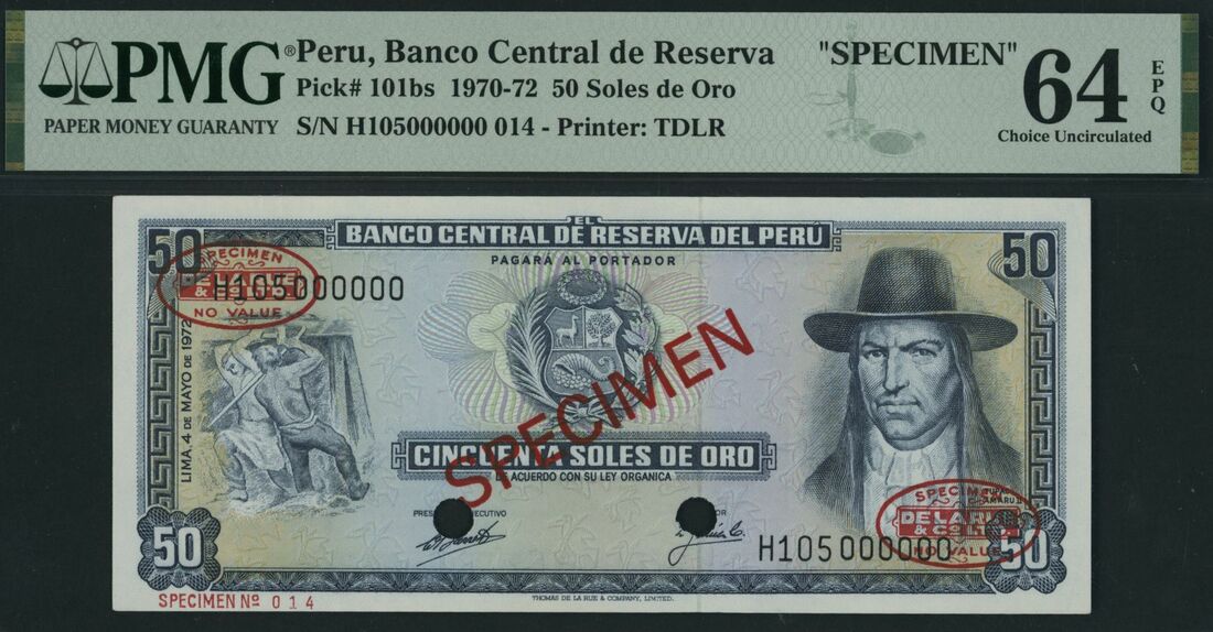 (x) Banco Central de Reserva, Peru, specimen 50 Soles de Oro, 1970-72, serial number H105000000 014, (Pick 101bs), in PMG holder 64 EPQ Choice Uncirculated