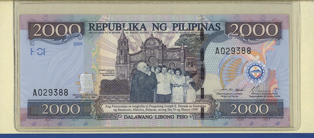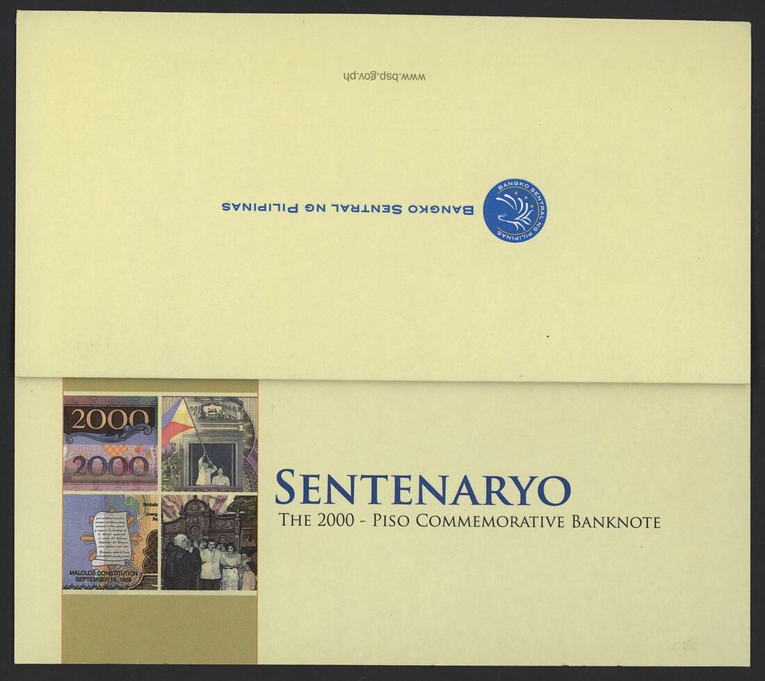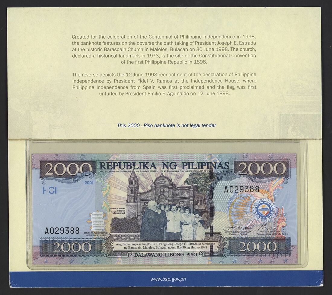 (x) Central Bank of the Philippines, Commemorative Issue, 2000 Piso, 2001, in original presentational booklet, serial number A029388, (Pick unlisted, BNB 1004), banknote is uncirculated, booklet shows evidence of handling