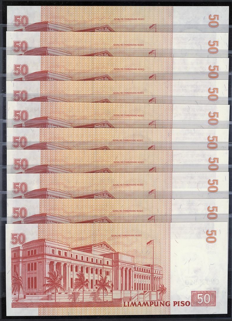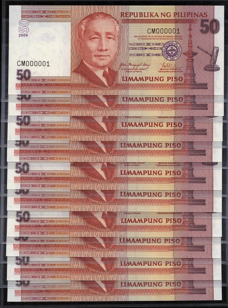 (x) Republic of the Philippines, [10 notes] 50 Piso, 2009, serial numbers CM000001, CM000002, CM000003, CM000004, CM000005, CM000006, CM000007, CM000008, CM000009, and CM000010