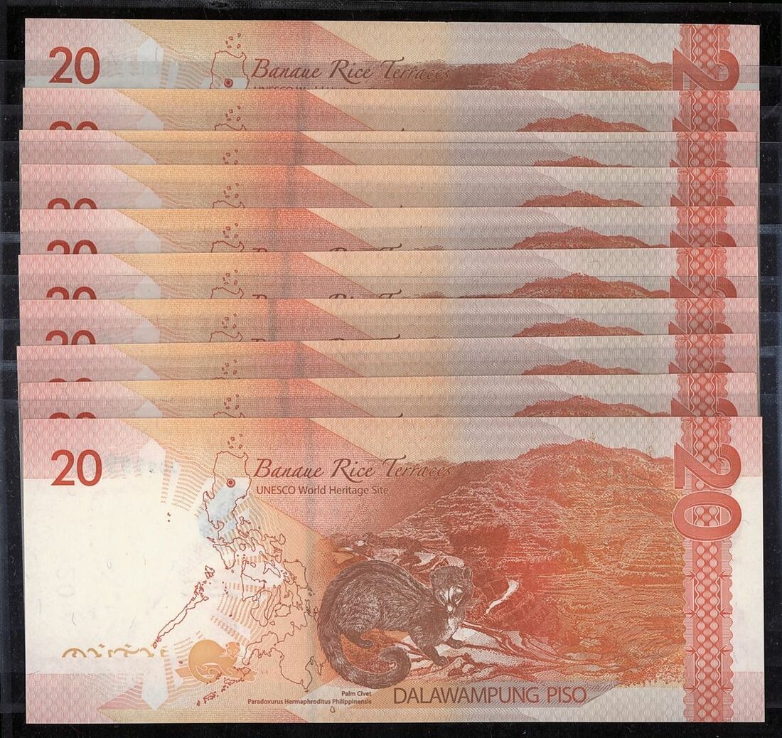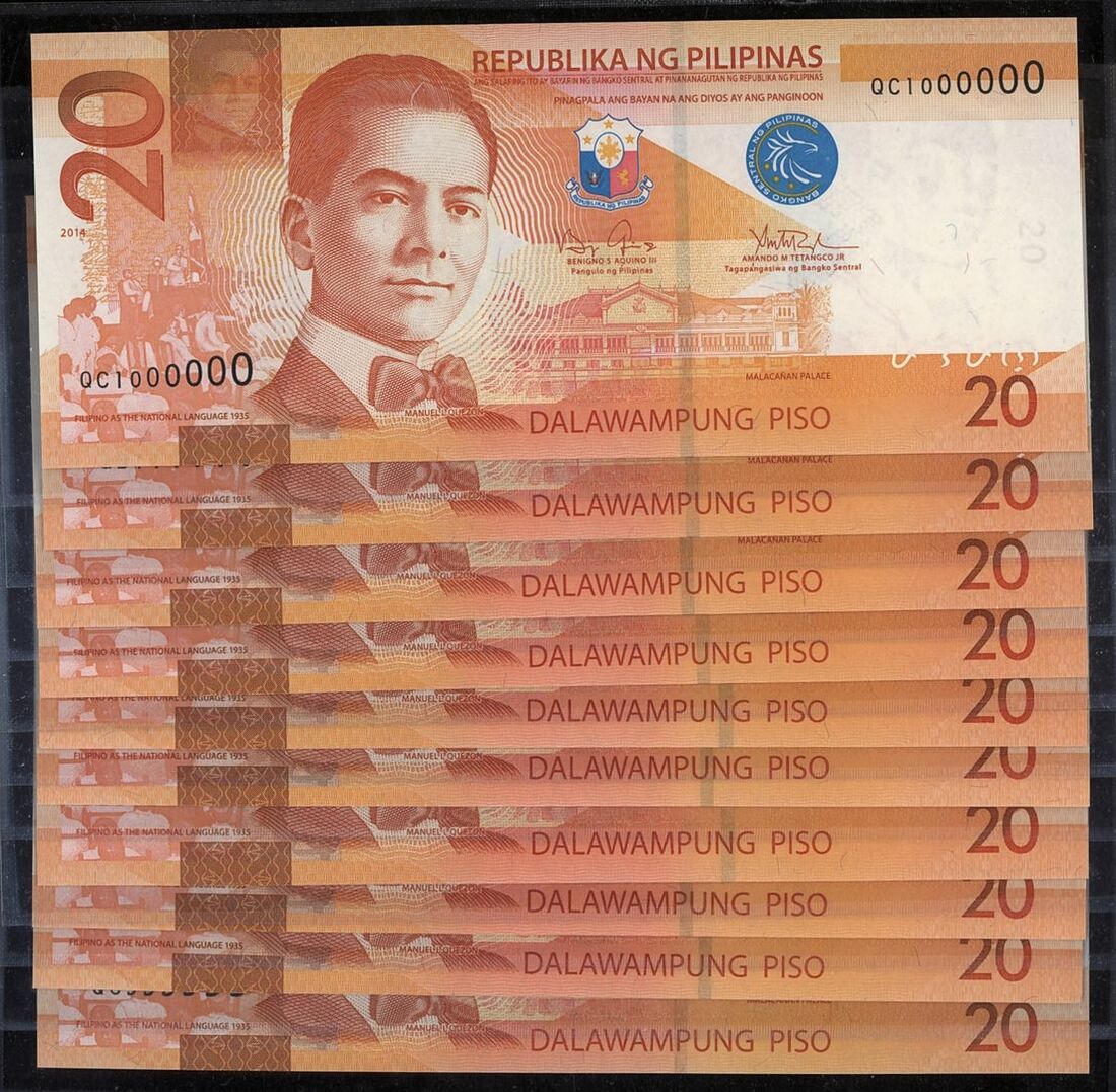 (x) Republic of the Philippines, [10 notes] 20 Piso, 2014, serial numbers QC1000000, QB111111, QB222222, QB333333, QB444444, QB555555, QC666666, QC777777, QC888888, and QC999999,