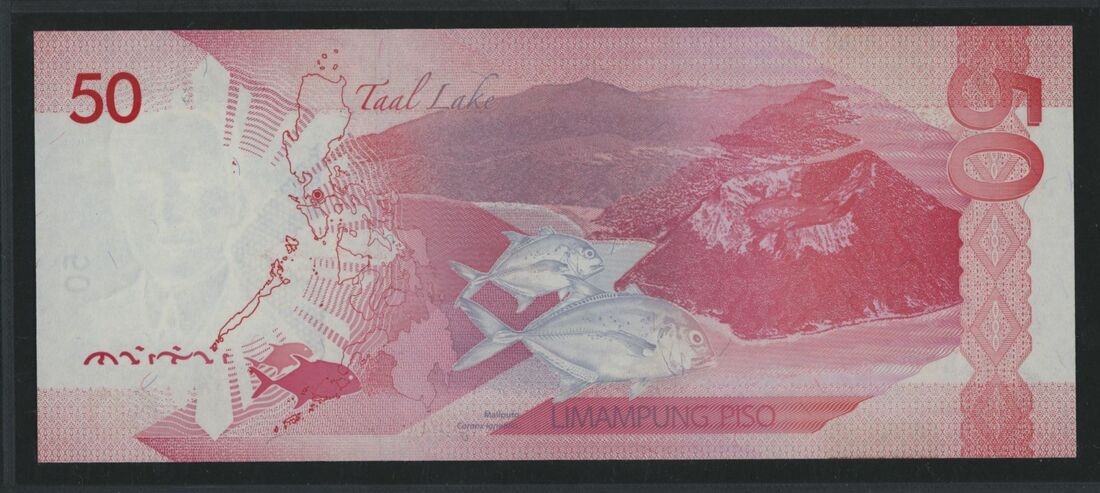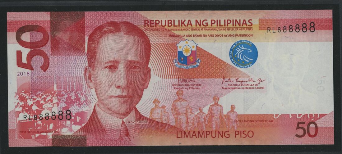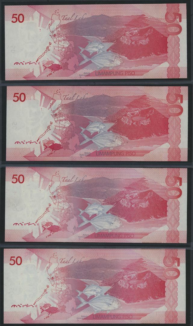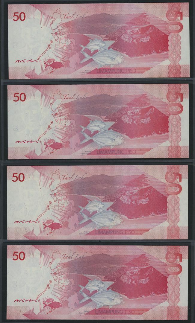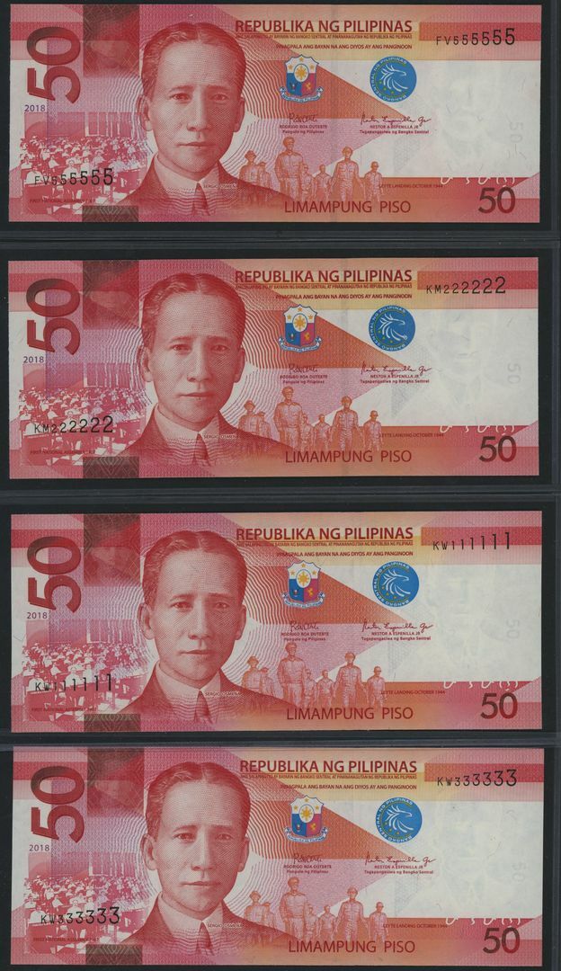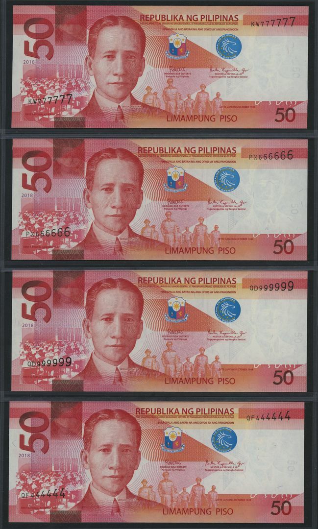 (x) Republic of the Philippines, [9 notes] 50 Piso, 2018, serial numbers FV555555, KM222222, KW111111, KW333333, KW777777, PX666666, QD999999, QF444444, and RL888888