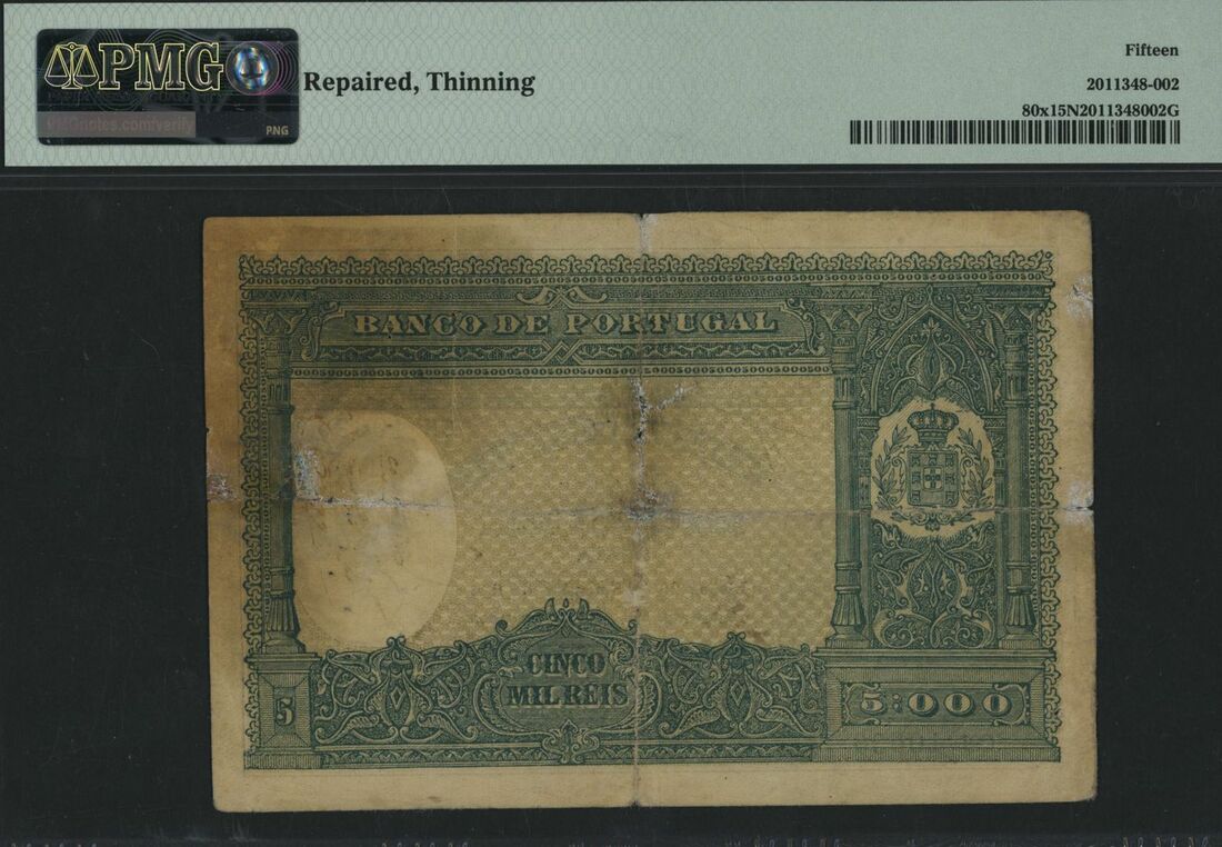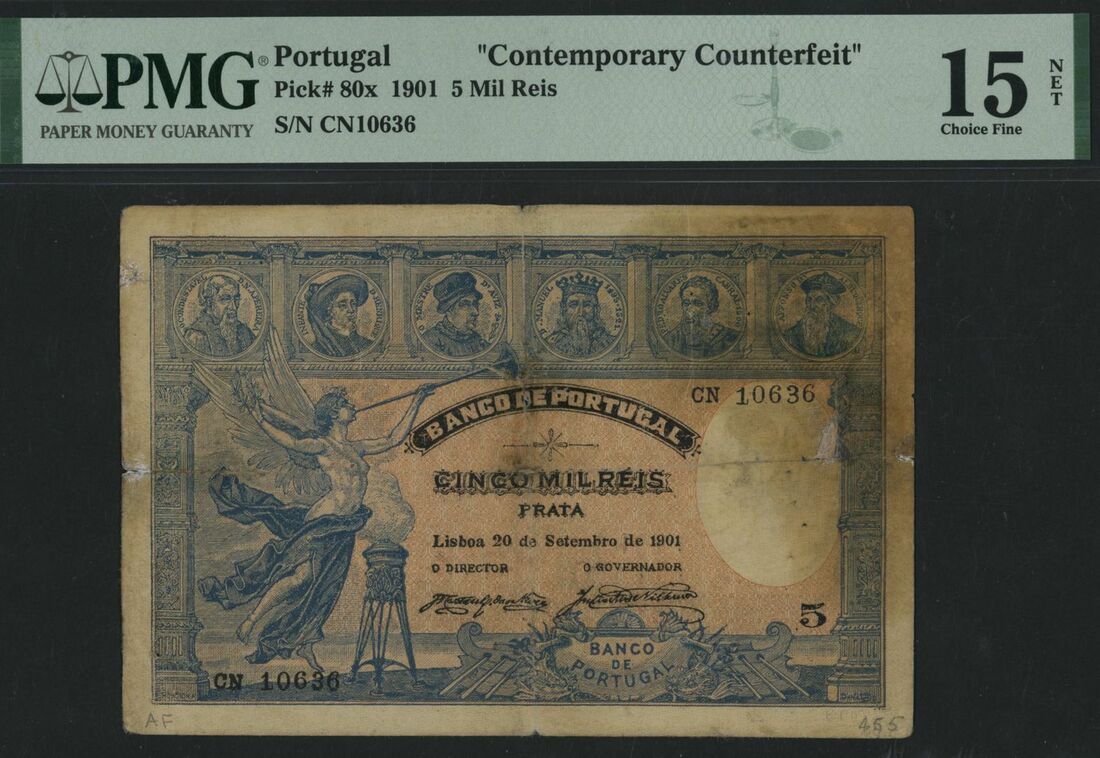 (x) Banco de Portugal, contemporary counterfeit 5000 Reis, 20th September 1901, serial number CN10636, (Pick 80x), in PMG holder 15 NET Choice Fine, repaired, thinning
