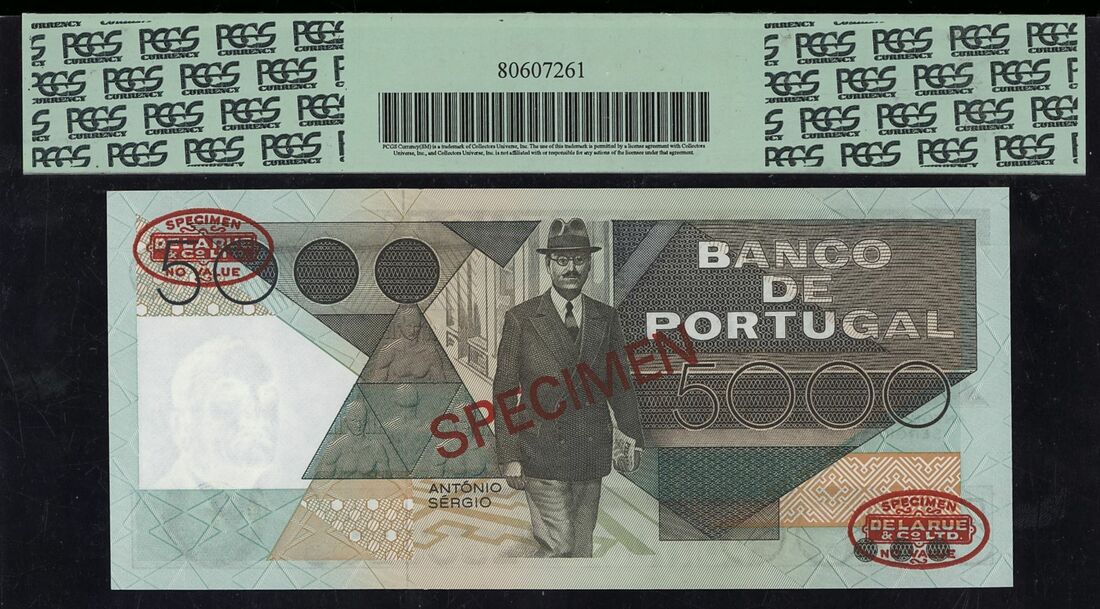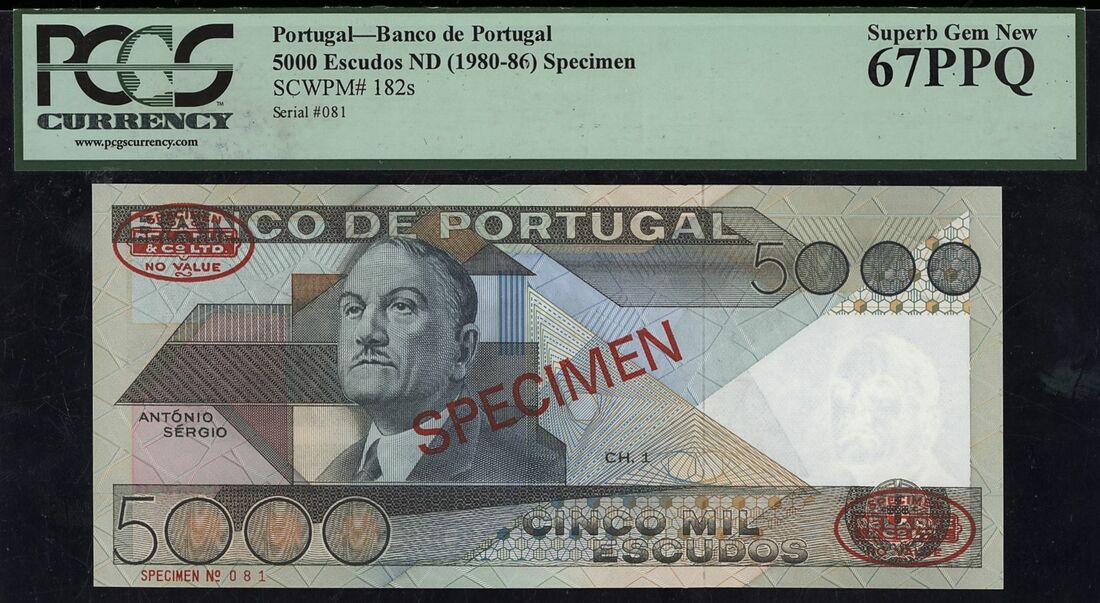(x) Banco de Portugal, specimen 5000 Escudos, Chapa 1, ND (1980-86), (Pick 182s), in PCGS holder 67 PPQ Superb Gem New