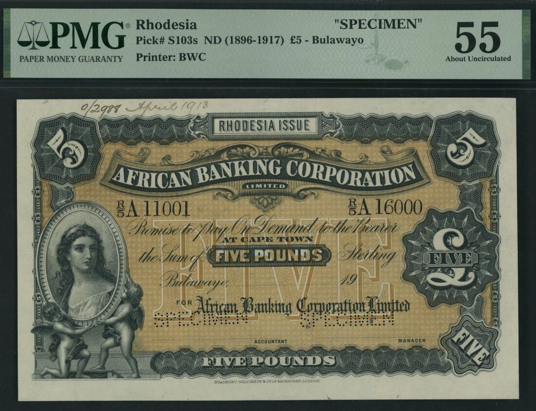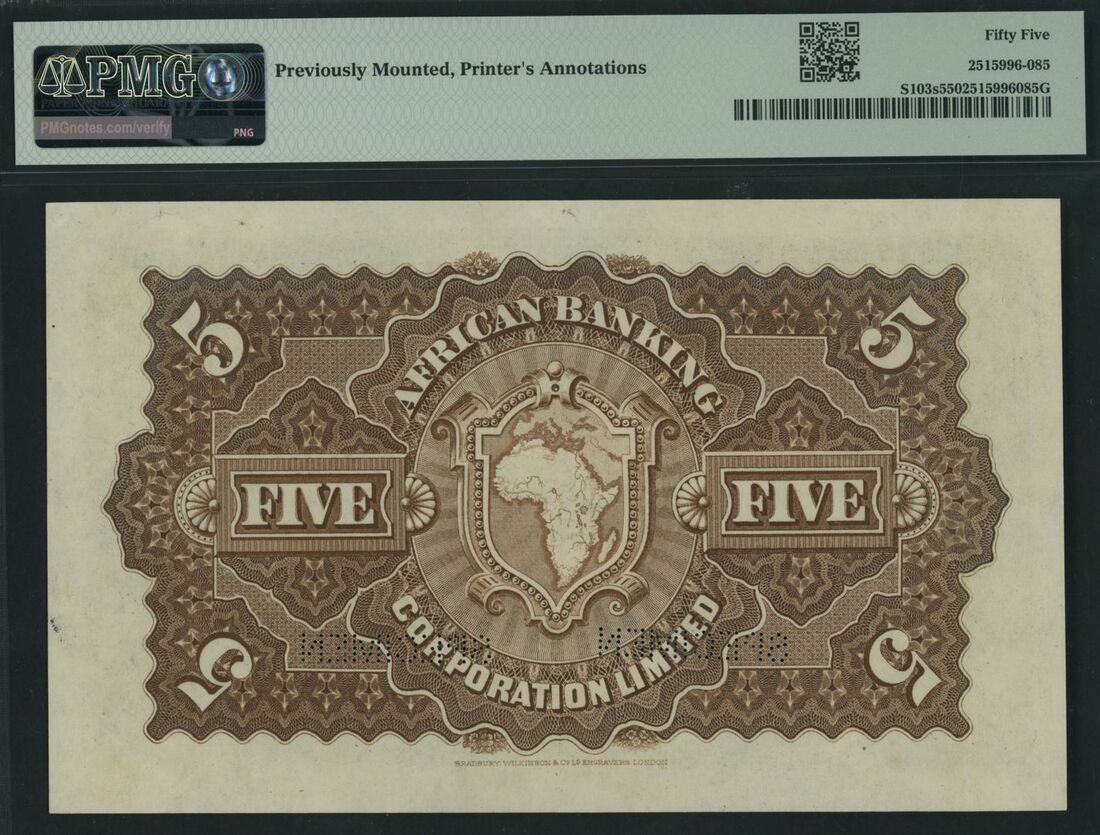 (x) African Banking Corporation, Rhodesia, specimen £5, Bulawayo, ND (1896-1917), serial number range R/5 A11001-R/5 A16000, (Pick S103s), in PMG holder 55 About Uncirculated, printer's annotations, previously mounted, very rare, only two notes graded by PMG