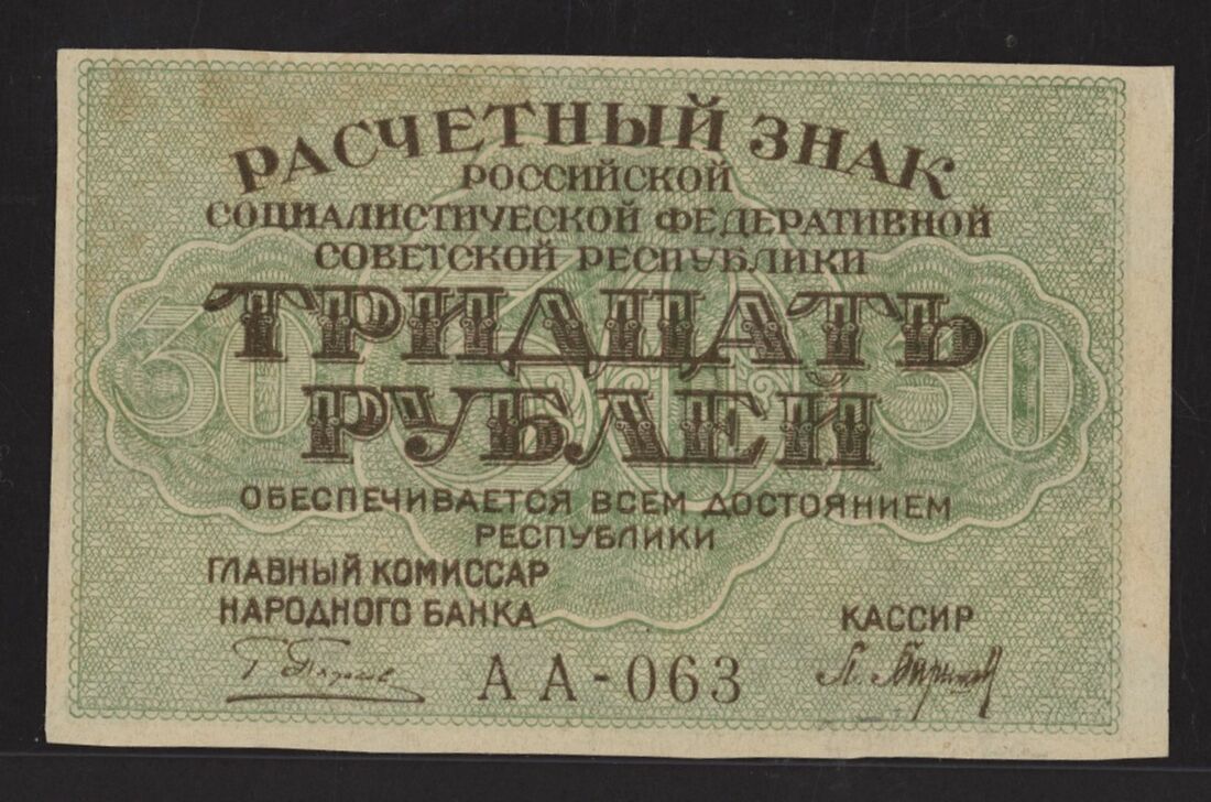 Soviet State Credit Note, 30 Rubles, error with inverted back, 1919, (Pick 99), about uncirculated, rare
