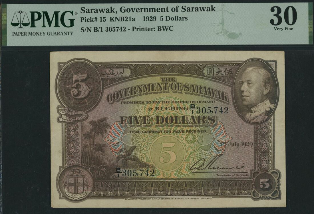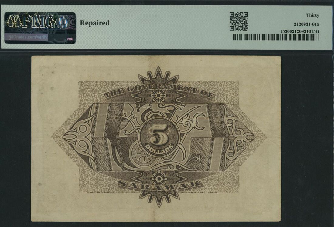 (x) Government of Sarawak, 5 Dollars, 1st July 1929, serial number B/1 305742, (Pick 15, KNB21a), in PMG holder 30 Very Fine, repaired