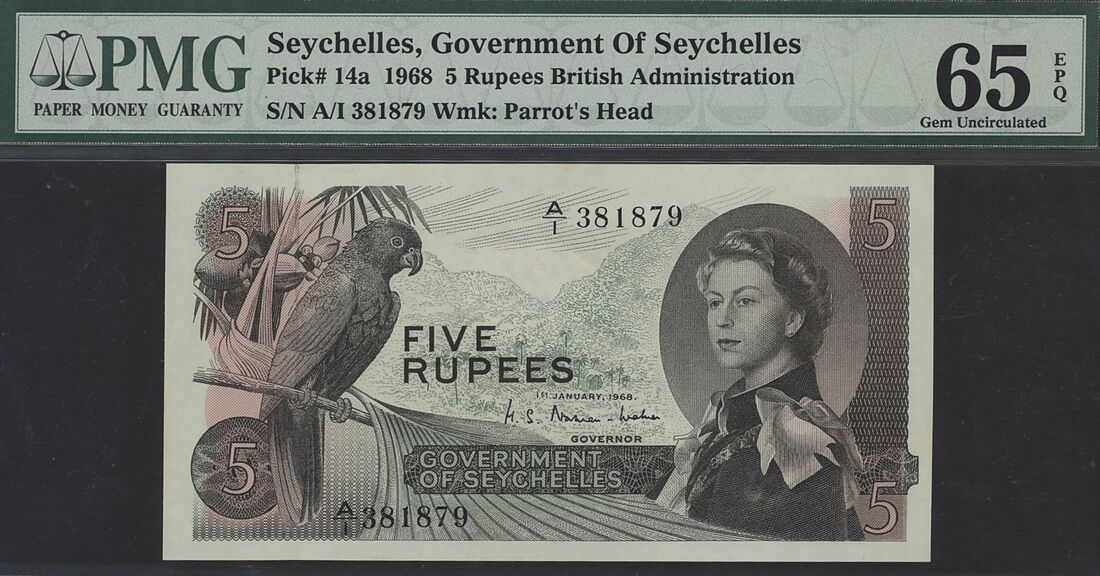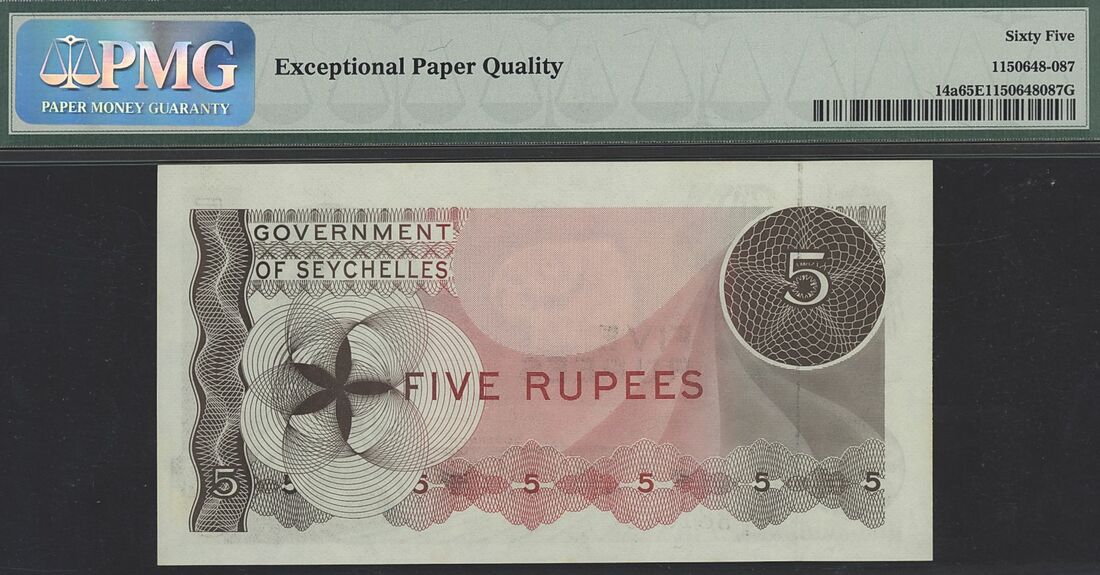 (x) Government of Seychelles, British Administration, 5 Rupees, 1st January 1968, serial number A/I 381879, (Pick 14a), in PMG holder 65 EPQ Gem Uncirculated