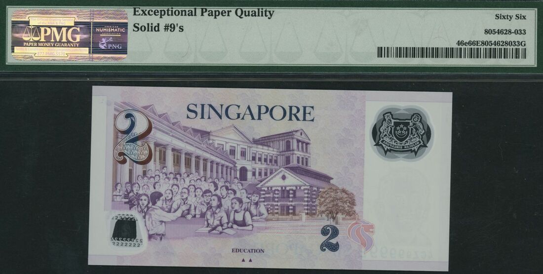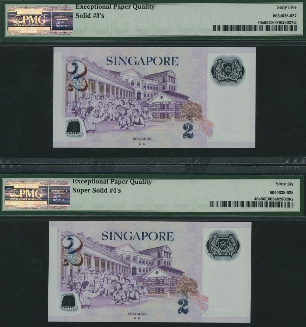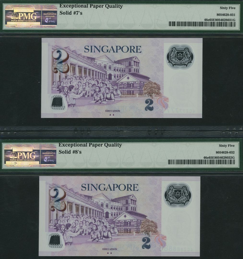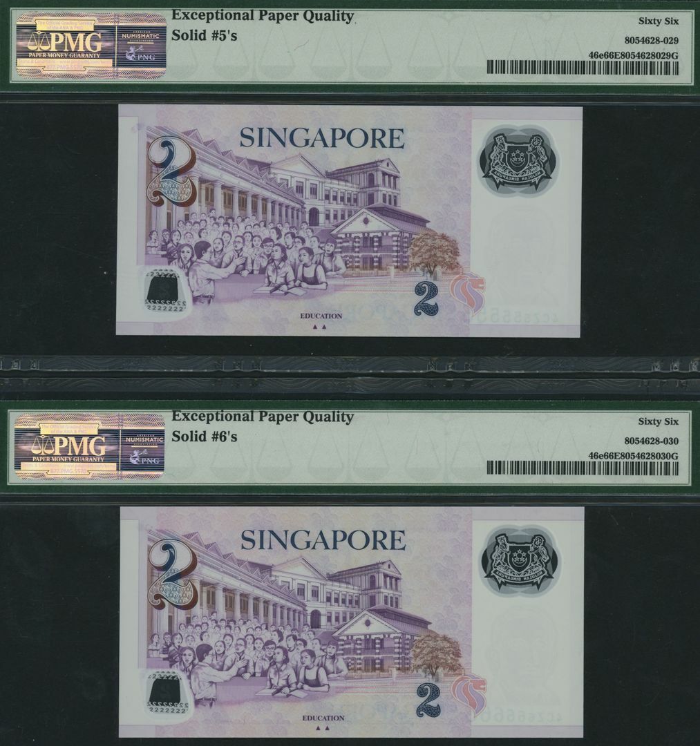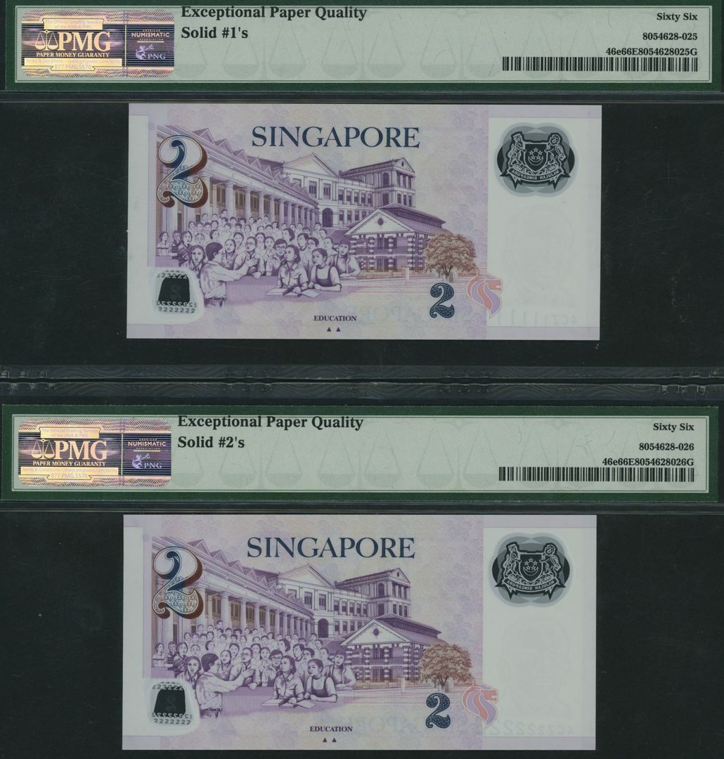(x) Monetary Authority, Singapore, Group of 9 banknotes with consecutive solid serial numbers, 2 Dollars, ND (2011), serial numbers 4CZ111111, 4CZ222222, 4CZ333333, 4CZ444444, 4CZ555555, 4CZ666666, 4CZ777777, 4CZ888888, 4CZ999999