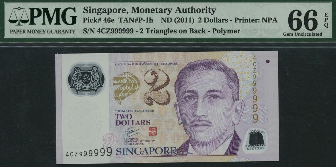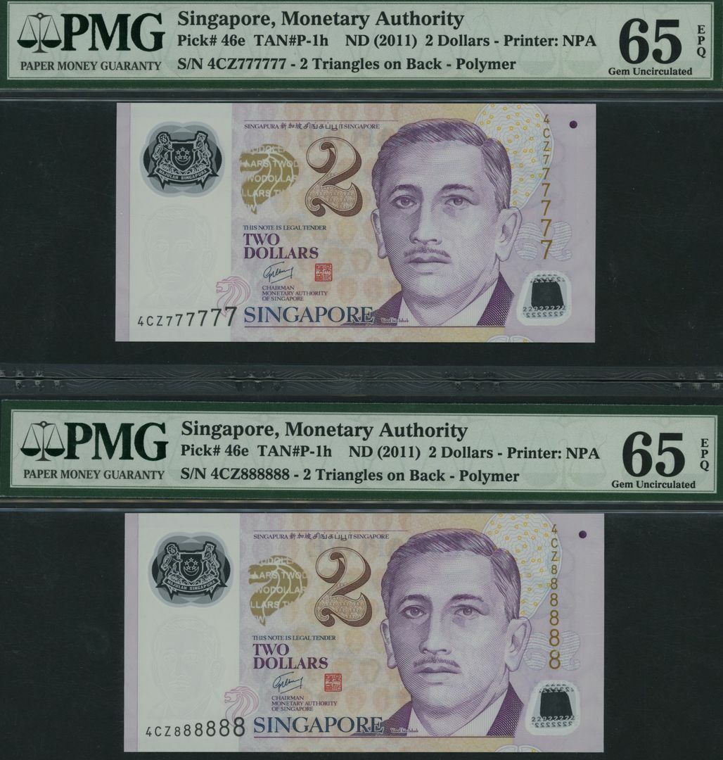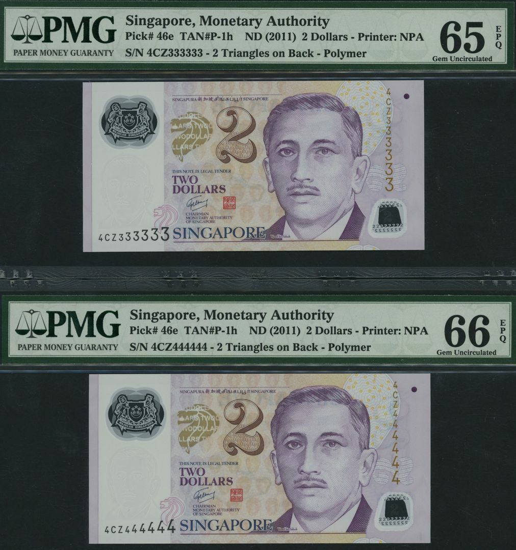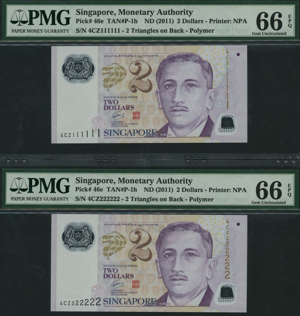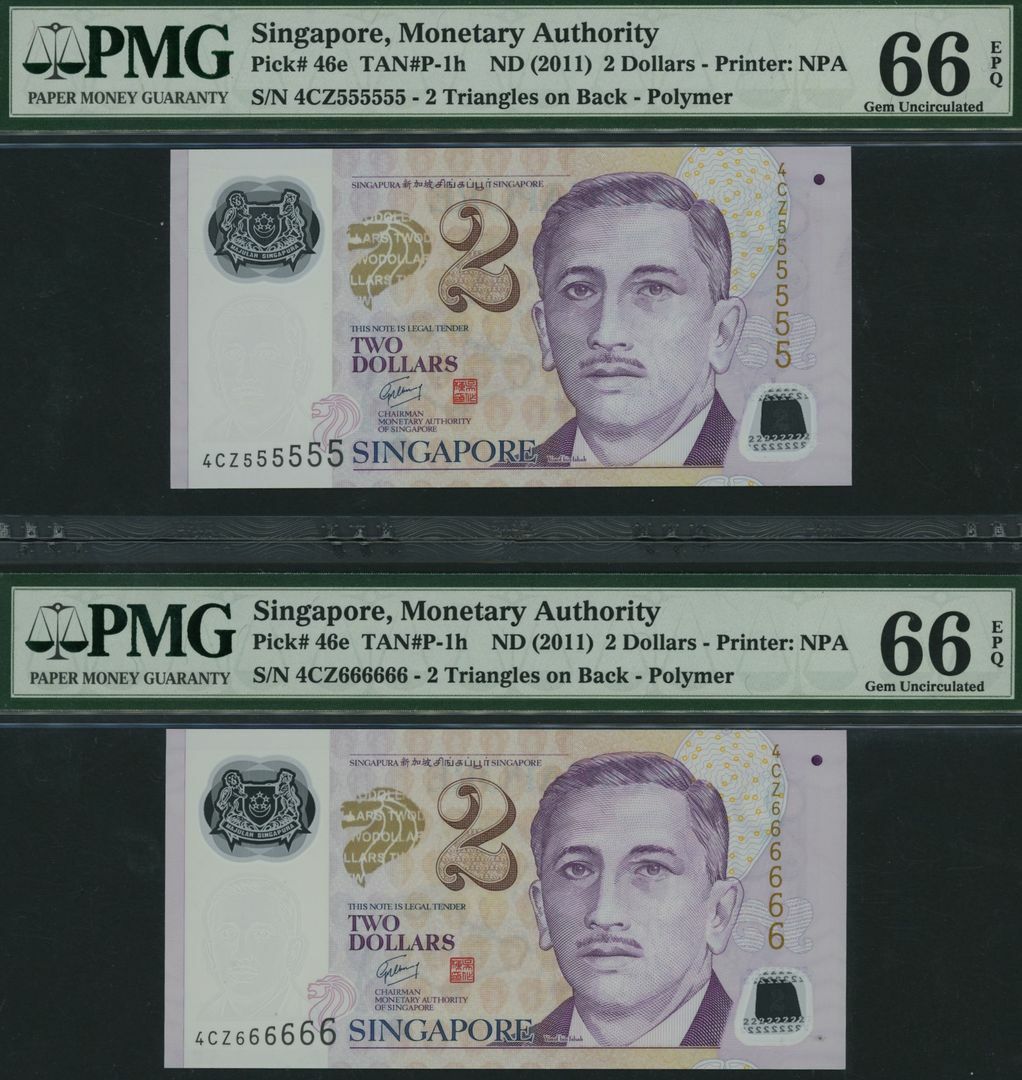 (x) Monetary Authority, Singapore, Group of 9 banknotes with consecutive solid serial numbers, 2 Dollars, ND (2011), serial numbers 4CZ111111, 4CZ222222, 4CZ333333, 4CZ444444, 4CZ555555, 4CZ666666, 4CZ777777, 4CZ888888, 4CZ999999
