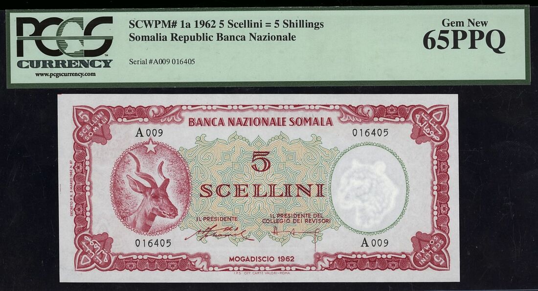 (x) Banca Nazionale Somala, Somalia, 5 Scellini, 1962, serial number A009 016405, (Pick 1a, BNB 101), in PCGS holder 65 PPQ Gem New