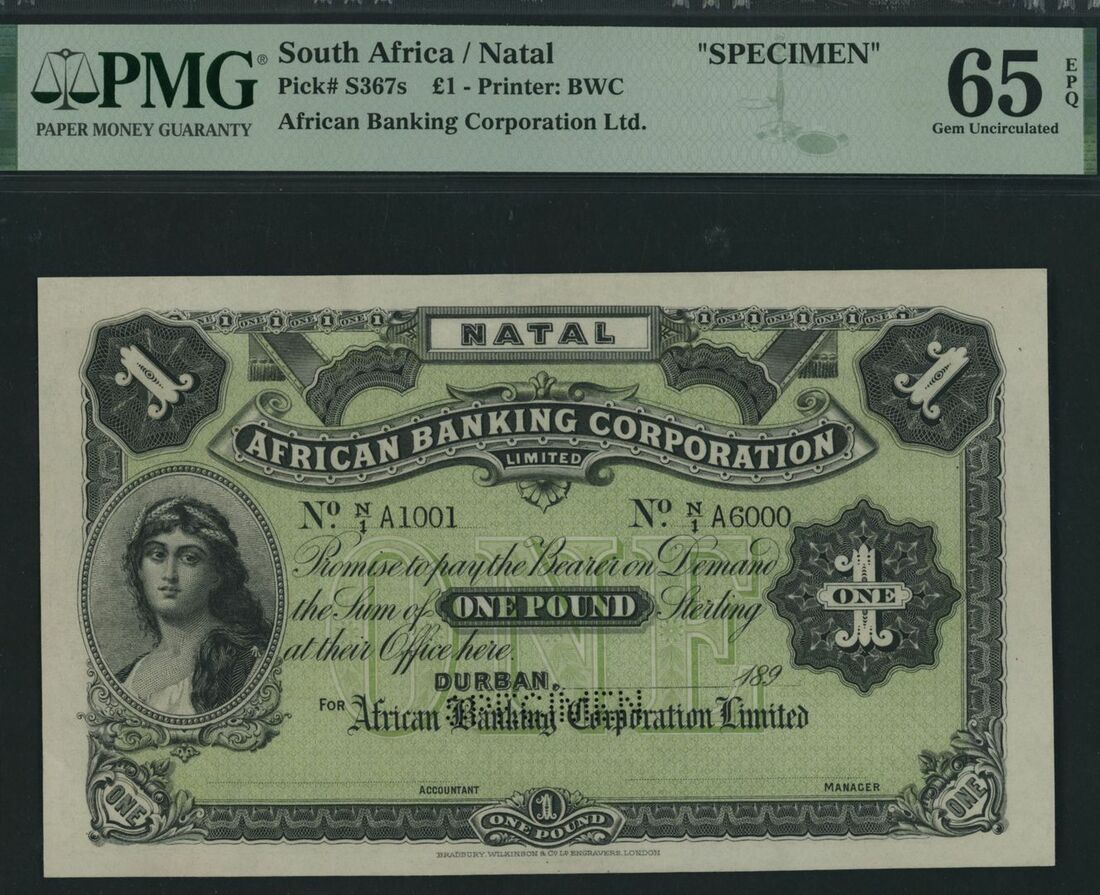 (x) African Banking Corporation, South Africa/Natal, [Top Pop] specimen £1, Durban, ND (ca. 1890s), serial number range N/1 A1001-N/1 A6000,