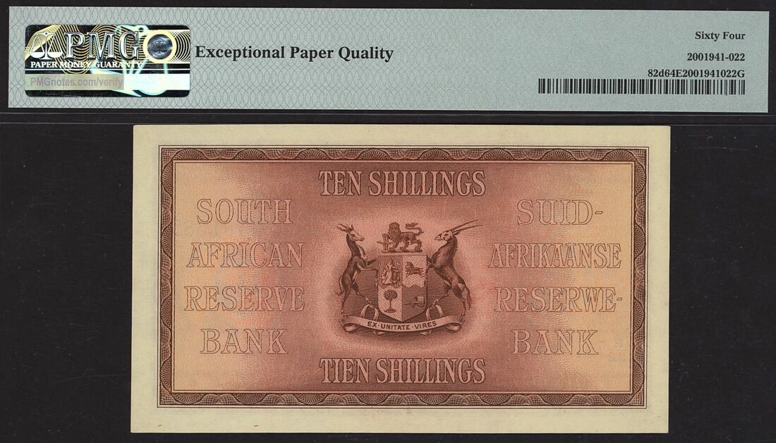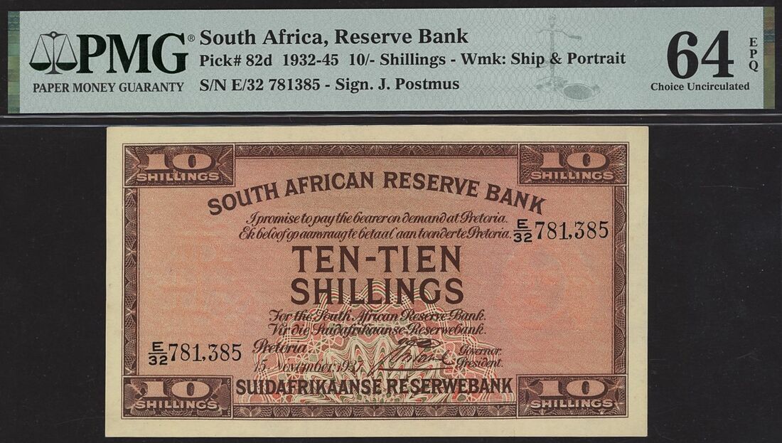 (x) South Africa Reserve Bank, 10 Shillings, 15th November 1937, serial number E/32 781385, (Pick 82d, BNB 710), in PMG holder 64 EPQ Choice Uncirculated