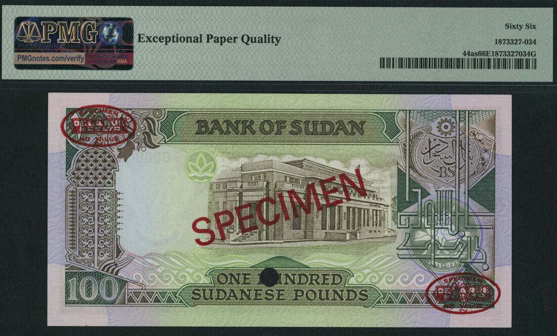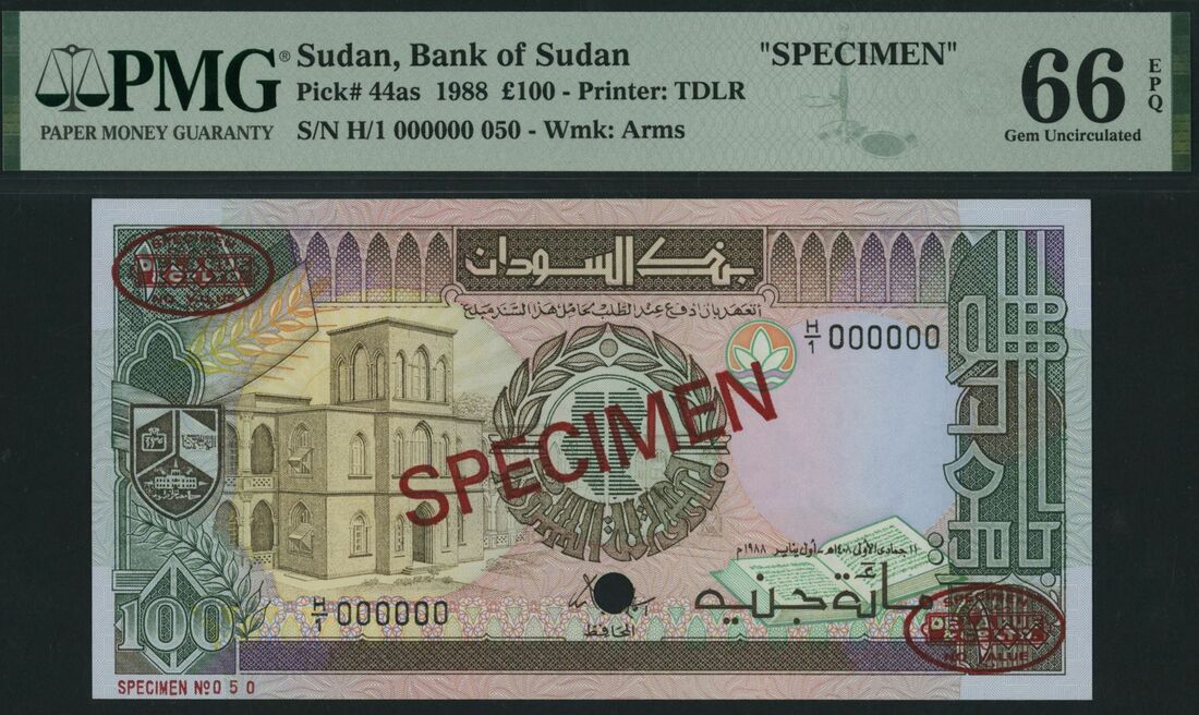 (x) Bank of Sudan, specimen £100, 1988, serial number H/1 000000 050, (Pick 44as), in PMG holder 66 EPQ Gem Uncirculated