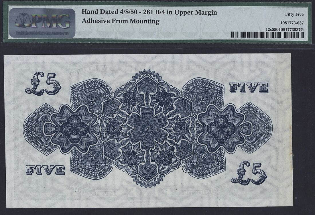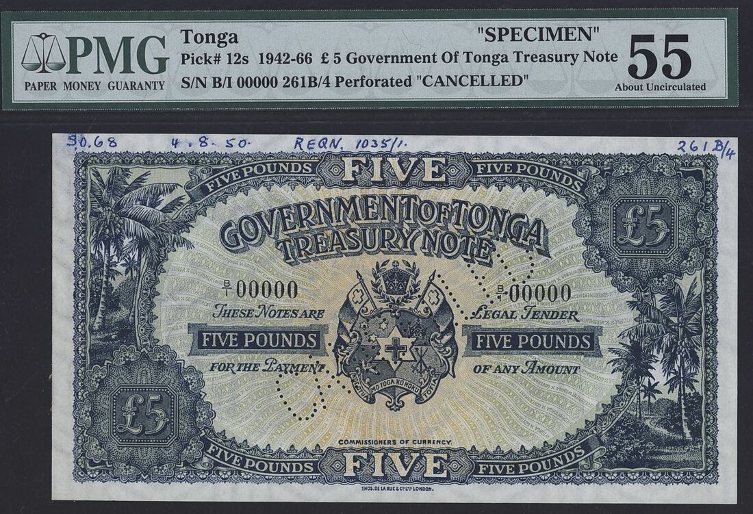 (x) Government of Tonga, specimen 5 Pounds, 1942-1966, hand dated 4/8/50, serial number B/I 00000 261B/4, perforated "cancelled"