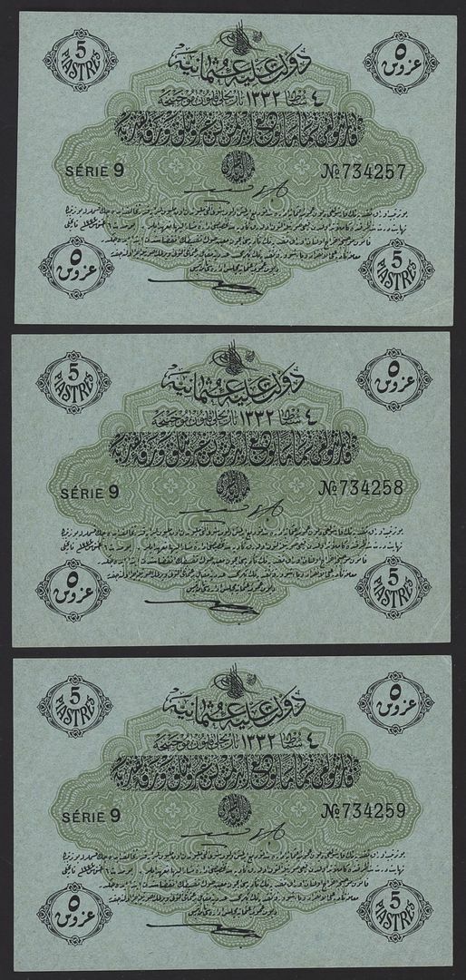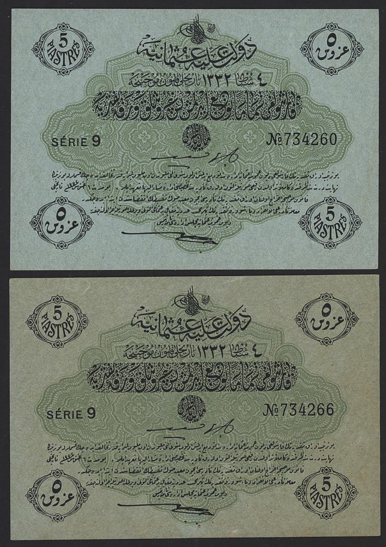 (x) Ottoman Empire, [5 notes] 5 Piastres, series 9, consecutive serial numbers 734257-60 and 734266, (Pick 87, BNB 87), one good extremely fine with pinholes, the rest uncirculated (5 notes)
